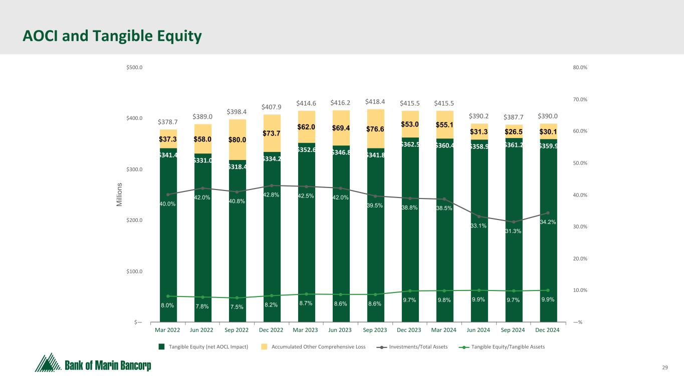 29 Text 95,96,96 Light Gray 232, 232, 232 Black 0, 0, 0 White 255, 255, 255 Accent 1 7,89,52 Accent 2 248,153,40 Accent 3 254,217,129 Accent 4 52,153,70 Accent 5 5,39,67 Accent 6 171,184,195 AOCI and Tangible Equity M ill io ns $378.7 $389.0 $398.4 $407.9 $414.6 $416.2 $418.4 $415.5 $415.5 $390.2 $387.7 $390.0 $341.4 $331.0 $318.4 $334.2 $352.6 $346.8 $341.8 $362.5 $360.4 $358.9 $361.2 $359.9 $37.3 $58.0 $80.0 $73.7 $62.0 $69.4 $76.6 $53.0 $55.1 $31.3 $26.5 $30.1 40.0% 42.0% 40.8% 42.8% 42.5% 42.0% 39.5% 38.8% 38.5% 33.1% 31.3% 34.2% 8.0% 7.8% 7.5% 8.2% 8.7% 8.6% 8.6% 9.7% 9.8% 9.9% 9.7% 9.9% Tangible Equity (net AOCL Impact) Accumulated Other Comprehensive Loss Investments/Total Assets Tangible Equity/Tangible Assets Mar 2022 Jun 2022 Sep 2022 Dec 2022 Mar 2023 Jun 2023 Sep 2023 Dec 2023 Mar 2024 Jun 2024 Sep 2024 Dec 2024 $— $100.0 $200.0 $300.0 $400.0 $500.0 —% 10.0% 20.0% 30.0% 40.0% 50.0% 60.0% 70.0% 80.0%