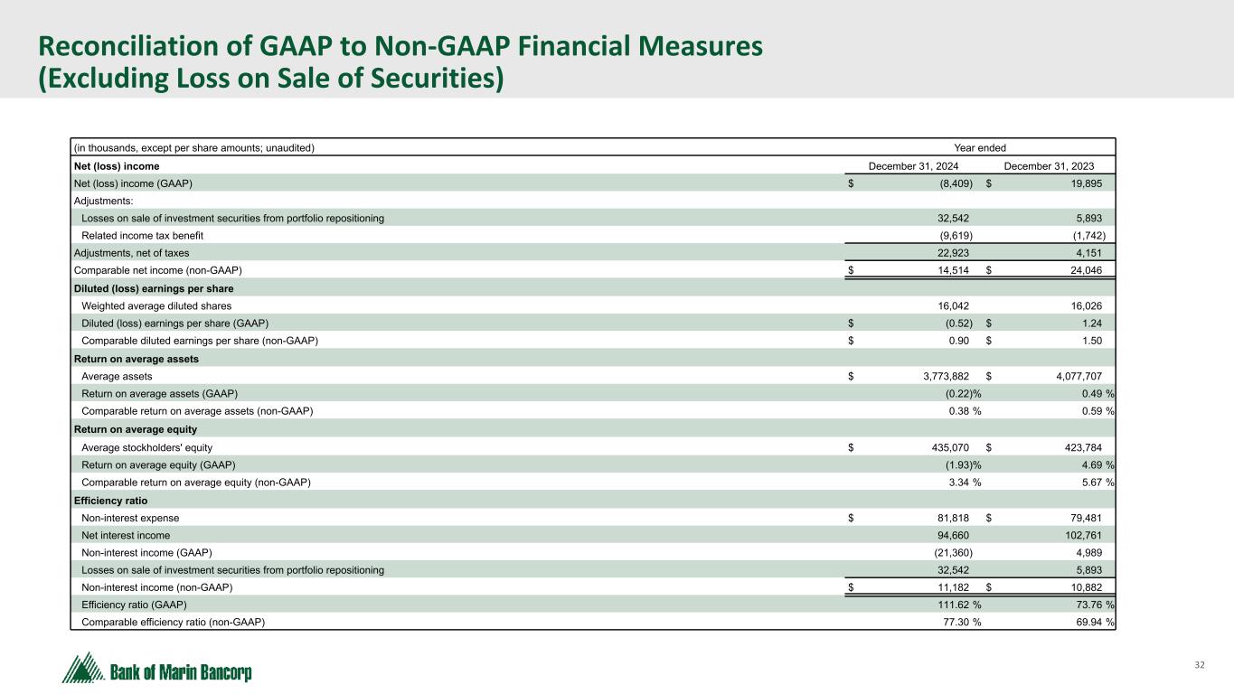 32 Text 95,96,96 Light Gray 232, 232, 232 Black 0, 0, 0 White 255, 255, 255 Accent 1 7,89,52 Accent 2 248,153,40 Accent 3 254,217,129 Accent 4 52,153,70 Accent 5 5,39,67 Accent 6 171,184,195 Reconciliation of GAAP to Non-GAAP Financial Measures (Excluding Loss on Sale of Securities) (in thousands, except per share amounts; unaudited) Year ended Net (loss) income December 31, 2024 December 31, 2023 Net (loss) income (GAAP) $ (8,409) $ 19,895 Adjustments: Losses on sale of investment securities from portfolio repositioning 32,542 5,893 Related income tax benefit (9,619) (1,742) Adjustments, net of taxes 22,923 4,151 Comparable net income (non-GAAP) $ 14,514 $ 24,046 Diluted (loss) earnings per share Weighted average diluted shares 16,042 16,026 Diluted (loss) earnings per share (GAAP) $ (0.52) $ 1.24 Comparable diluted earnings per share (non-GAAP) $ 0.90 $ 1.50 Return on average assets Average assets $ 3,773,882 $ 4,077,707 Return on average assets (GAAP) (0.22) % 0.49 % Comparable return on average assets (non-GAAP) 0.38 % 0.59 % Return on average equity Average stockholders' equity $ 435,070 $ 423,784 Return on average equity (GAAP) (1.93) % 4.69 % Comparable return on average equity (non-GAAP) 3.34 % 5.67 % Efficiency ratio Non-interest expense $ 81,818 $ 79,481 Net interest income 94,660 102,761 Non-interest income (GAAP) (21,360) 4,989 Losses on sale of investment securities from portfolio repositioning 32,542 5,893 Non-interest income (non-GAAP) $ 11,182 $ 10,882 Efficiency ratio (GAAP) 111.62 % 73.76 % Comparable efficiency ratio (non-GAAP) 77.30 % 69.94 %