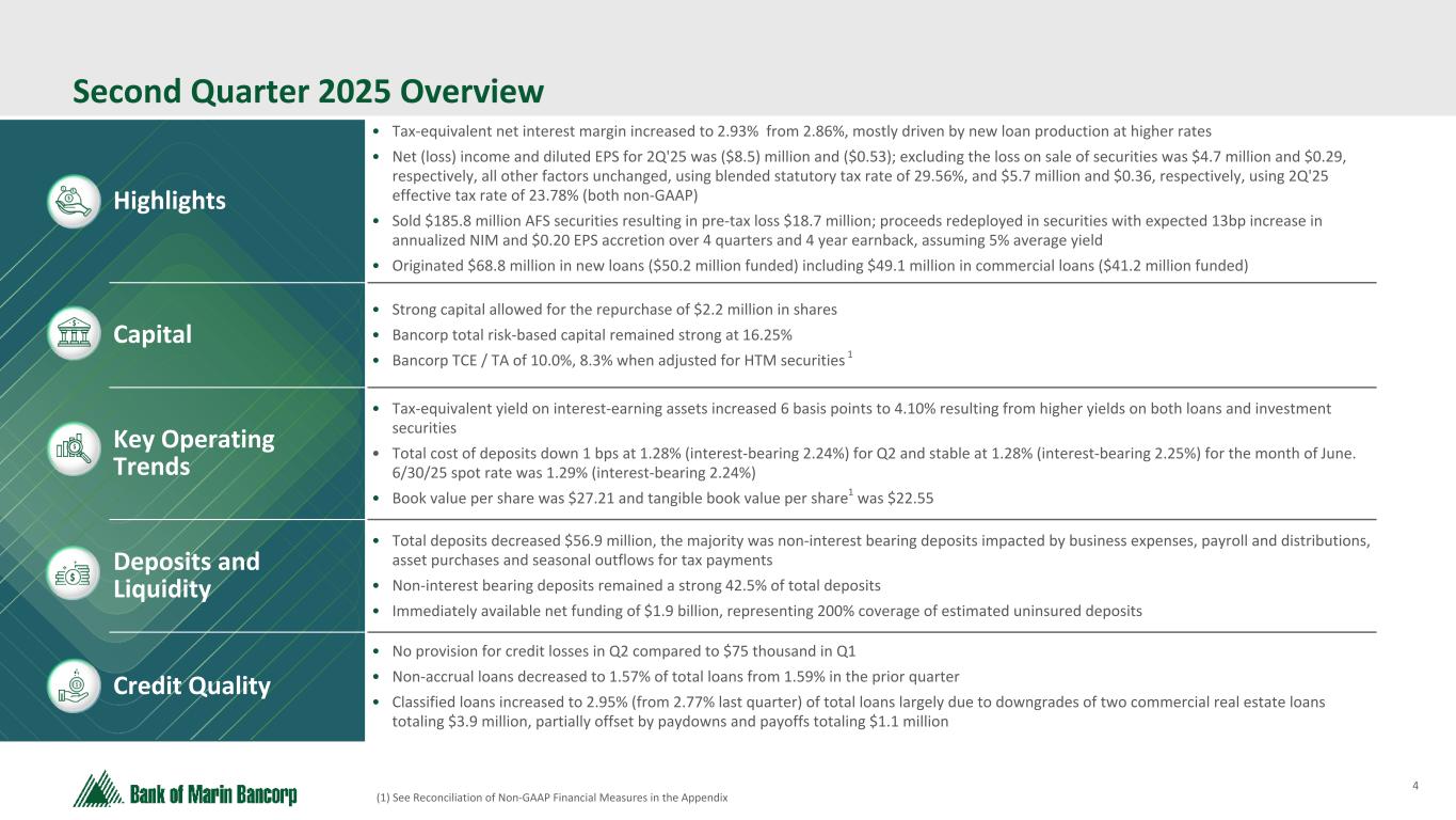 3 Text 95,96,96 Light Gray 232, 232, 232 Black 0, 0, 0 White 255, 255, 255 Accent 1 7,89,52 Accent 2 248,153,40 Accent 3 254,217,129 Accent 4 52,153,70 Accent 5 5,39,67 Accent 6 171,184,195 Bank of Marin Bancorp Novato, CA Headquarters BMRC NASDAQ $368.1 Million Market Cap $3.7 Billion Total Assets 4.38% Dividend Yield 16.25% Total RBC BMRC AT A GLANCE O P T I O N 2 Data as of 6/30/25 Relationship Banking Build strong, long-term customer relationships based on trust, integrity and expertise, inspiring loyalty though exceptional service. Disciplined Fundamentals Apply a disciplined business approach with sound banking practices, high quality products, and consistent fundamentals ensuring continued strong results. Community Commitment Give back to the communities that we serve through active employee volunteerism, nonprofit board leadership and financial contributions. 27 Branch Locations 8 Commercial Banking Offices