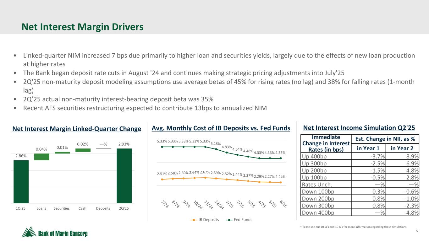 4 Text 95,96,96 Light Gray 232, 232, 232 Black 0, 0, 0 White 255, 255, 255 Accent 1 7,89,52 Accent 2 248,153,40 Accent 3 254,217,129 Accent 4 52,153,70 Accent 5 5,39,67 Accent 6 171,184,195 Second Quarter 2025 Overview (1) See Reconciliation of Non-GAAP Financial Measures in the Appendix Highlights • Tax-equivalent net interest margin increased to 2.93% from 2.86%, mostly driven by new loan production at higher rates • Net (loss) income and diluted EPS for 2Q'25 was ($8.5) million and ($0.53); excluding the loss on sale of securities was $4.7 million and $0.29, respectively, all other factors unchanged, using blended statutory tax rate of 29.56%, and $5.7 million and $0.36, respectively, using 2Q'25 effective tax rate of 23.78% (both non-GAAP) • Sold $185.8 million AFS securities resulting in pre-tax loss $18.7 million; proceeds redeployed in securities with expected 13bp increase in annualized NIM and $0.20 EPS accretion over 4 quarters and 4 year earnback, assuming 5% average yield • Originated $68.8 million in new loans ($50.2 million funded) including $49.1 million in commercial loans ($41.2 million funded) Capital • Strong capital allowed for the repurchase of $2.2 million in shares • Bancorp total risk-based capital remained strong at 16.25% • Bancorp TCE / TA of 10.0%, 8.3% when adjusted for HTM securities 1 Key Operating Trends • Tax-equivalent yield on interest-earning assets increased 6 basis points to 4.10% resulting from higher yields on both loans and investment securities • Total cost of deposits down 1 bps at 1.28% (interest-bearing 2.24%) for Q2 and stable at 1.28% (interest-bearing 2.25%) for the month of June. 6/30/25 spot rate was 1.29% (interest-bearing 2.24%) • Book value per share was $27.21 and tangible book value per share1 was $22.55 Deposits and Liquidity • Total deposits decreased $56.9 million, the majority was non-interest bearing deposits impacted by business expenses, payroll and distributions, asset purchases and seasonal outflows for tax payments • Non-interest bearing deposits remained a strong 42.5% of total deposits • Immediately available net funding of $1.9 billion, representing 200% coverage of estimated uninsured deposits Credit Quality • No provision for credit losses in Q2 compared to $75 thousand in Q1 • Non-accrual loans decreased to 1.57% of total loans from 1.59% in the prior quarter • Classified loans increased to 2.95% (from 2.77% last quarter) of total loans largely due to downgrades of two commercial real estate loans totaling $3.9 million, partially offset by paydowns and payoffs totaling $1.1 million