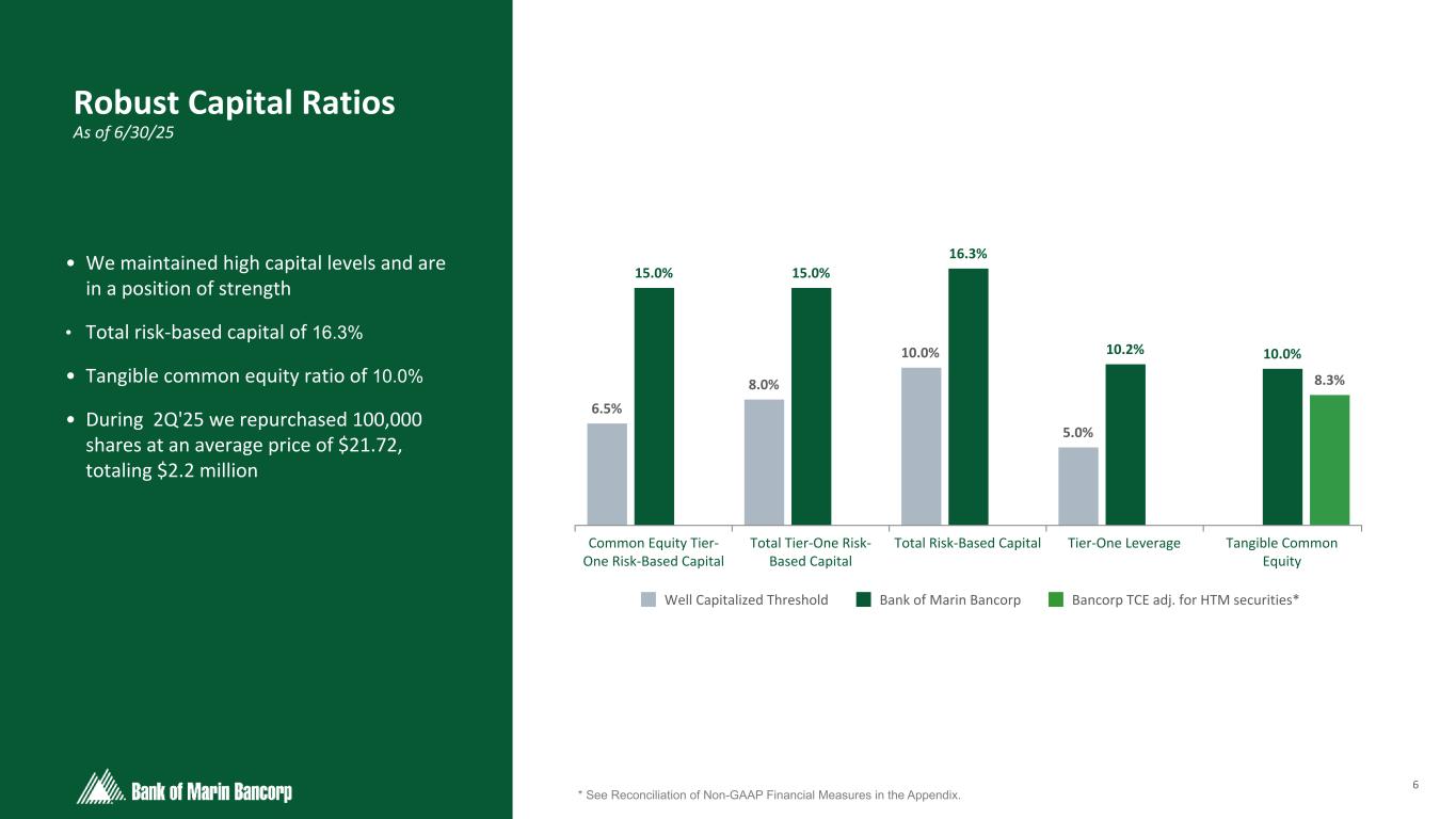 5 Text 95,96,96 Light Gray 232, 232, 232 Black 0, 0, 0 White 255, 255, 255 Accent 1 7,89,52 Accent 2 248,153,40 Accent 3 254,217,129 Accent 4 52,153,70 Accent 5 5,39,67 Accent 6 171,184,195 • Linked-quarter NIM increased 7 bps due primarily to higher loan and securities yields, largely due to the effects of new loan production at higher rates • The Bank began deposit rate cuts in August '24 and continues making strategic pricing adjustments into July'25 • 2Q'25 non-maturity deposit modeling assumptions use average betas of 45% for rising rates (no lag) and 38% for falling rates (1-month lag) • 2Q’25 actual non-maturity interest-bearing deposit beta was 35% • Recent AFS securities restructuring expected to contribute 13bps to annualized NIM Net Interest Margin Drivers 2.86% 0.04% 0.01% 0.02% —% 2.93% 1Q'25 Loans Securities Cash Deposits 2Q'25 Net Interest Margin Linked-Quarter Change 2.51% 2.58% 2.60% 2.64% 2.67% 2.59% 2.52% 2.44% 2.37% 2.29% 2.27% 2.24% 5.33% 5.33% 5.33% 5.33% 5.33% 5.13% 4.83% 4.64% 4.48% 4.33% 4.33% 4.33% IB Deposits Fed Funds 7/24 8/24 9/24 10/24 11/24 12/24 1/25 2/25 3/25 4/25 5/25 6/25 Avg. Monthly Cost of IB Deposits vs. Fed Funds Immediate Change in Interest Rates (in bps) Est. Change in NII, as % in Year 1 in Year 2 Up 400bp -3.7 % 8.9 % Up 300bp -2.5 % 6.9 % Up 200bp -1.5 % 4.8 % Up 100bp -0.5 % 2.8 % Rates Unch. — % — % Down 100bp 0.3 % -0.6 % Down 200bp 0.8 % -1.0 % Down 300bp 0.8 % -2.3 % Down 400bp — % -4.8 % *Please see our 10-Q’s and 10-K’s for more information regarding these simulations. Net Interest Income Simulation Q2'25
