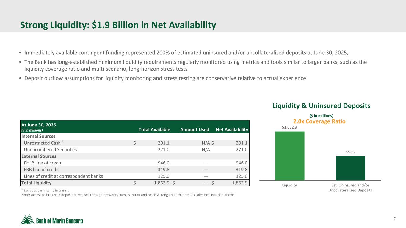 6 Text 95,96,96 Light Gray 232, 232, 232 Black 0, 0, 0 White 255, 255, 255 Accent 1 7,89,52 Accent 2 248,153,40 Accent 3 254,217,129 Accent 4 52,153,70 Accent 5 5,39,67 Accent 6 171,184,195 Robust Capital Ratios As of 6/30/25 • We maintained high capital levels and are in a position of strength • Total risk-based capital of 16.3% • Tangible common equity ratio of 10.0% • During 2Q'25 we repurchased 100,000 shares at an average price of $21.72, totaling $2.2 million * See Reconciliation of Non-GAAP Financial Measures in the Appendix. 6.5% 8.0% 10.0% 5.0% 15.0% 15.0% 16.3% 10.2% 10.0% 8.3% Well Capitalized Threshold Bank of Marin Bancorp Bancorp TCE adj. for HTM securities* Common Equity Tier- One Risk-Based Capital Total Tier-One Risk- Based Capital Total Risk-Based Capital Tier-One Leverage Tangible Common Equity
