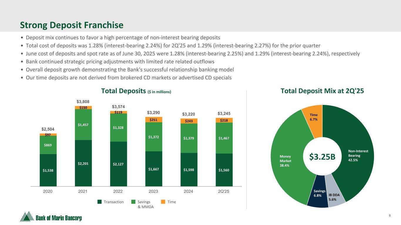 7 Text 95,96,96 Light Gray 232, 232, 232 Black 0, 0, 0 White 255, 255, 255 Accent 1 7,89,52 Accent 2 248,153,40 Accent 3 254,217,129 Accent 4 52,153,70 Accent 5 5,39,67 Accent 6 171,184,195 Strong Liquidity: $1.9 Billion in Net Availability • Immediately available contingent funding represented 200% of estimated uninsured and/or uncollateralized deposits at June 30, 2025, • The Bank has long-established minimum liquidity requirements regularly monitored using metrics and tools similar to larger banks, such as the liquidity coverage ratio and multi-scenario, long-horizon stress tests • Deposit outflow assumptions for liquidity monitoring and stress testing are conservative relative to actual experience Liquidity & Uninsured Deposits ($ in millions) 2.0x Coverage Ratio At June 30, 2025 ($ in millions) Total Available Amount Used Net Availability Internal Sources Unrestricted Cash 1 $ 201.1 N/A $ 201.1 Unencumbered Securities 271.0 N/A 271.0 External Sources FHLB line of credit 946.0 — 946.0 FRB line of credit 319.8 — 319.8 Lines of credit at correspondent banks 125.0 — 125.0 Total Liquidity $ 1,862.9 $ — $ 1,862.9 1 Excludes cash items in transit Note: Access to brokered deposit purchases through networks such as Intrafi and Reich & Tang and brokered CD sales not included above $1,862.9 $933 Liquidity Est. Uninsured and/or Uncollateralized Deposits