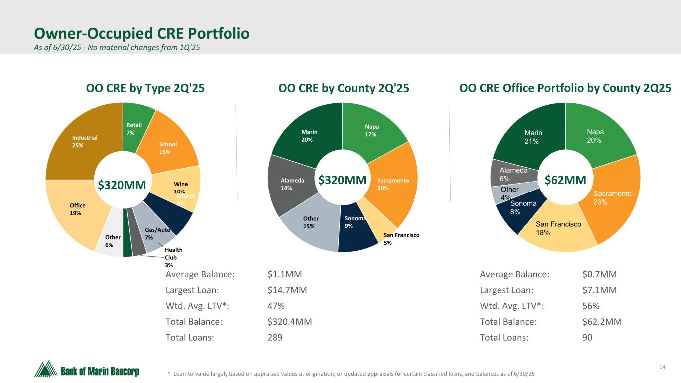 13 Text 95,96,96 Light Gray 232, 232, 232 Black 0, 0, 0 White 255, 255, 255 Accent 1 7,89,52 Accent 2 248,153,40 Accent 3 254,217,129 Accent 4 52,153,70 Accent 5 5,39,67 Accent 6 171,184,195 • $361 million in credit exposure spread across our lending footprint comprised of 147 loans • $2.5 million average loan balance – largest loan at $15.8 million • 64% weighted average loan-to-value and 1.62x weighted average debt-service coverage ratio* • City of San Francisco NOO CRE office exposure is 3% of total loan portfolio and 5% of total NOO CRE loans NOO CRE Office Portfolio by County * Calculated for loans exceeding $1 million, based on the most recent annual review process, and net of individual reserves Non-owner Occupied Office Exposure As of 6/30/25 - No material changes from 1Q'25 San Francisco 17% Alameda 8% Sacramento 6% Napa 8% Other Bay Area 15% Other 4% Marin 24% Sonoma 18% $361MM City of S.F. NOO CRE Office Portfolio Total Balance: $61.1 million Average Loan Bal: $5.1 million Number of Loans: 12 loans Wtd. Average LTV*: 63% Wtd. Average DCR: 1.31x Average Occupancy: 81% 11 of the 12 loans are secured by low rise buildings and one loan is secured by a 10 story building