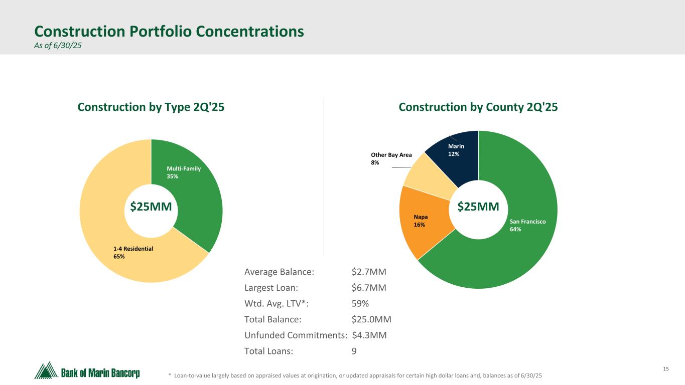 14 Text 95,96,96 Light Gray 232, 232, 232 Black 0, 0, 0 White 255, 255, 255 Accent 1 7,89,52 Accent 2 248,153,40 Accent 3 254,217,129 Accent 4 52,153,70 Accent 5 5,39,67 Accent 6 171,184,195 ($ in millions at Fair Value) * Loan-to-value largely based on appraised values at origination, or updated appraisals for certain classified loans, and balances as of 6/30/25 Owner-Occupied CRE Portfolio As of 6/30/25 - No material changes from 1Q'25 Retail 7% School 15% Wine 10% Church 6% Gas/Auto 7% Health Club 3% Other 6% Office 19% Industrial 25% Napa 17% Sacramento 20% San Francisco 5% Sonoma 9% Other 15% Alameda 14% Marin 20% OO CRE by County 2Q'25 Average Balance: $1.1MM Largest Loan: $14.7MM Wtd. Avg. LTV*: 47% Total Balance: $320.4MM Total Loans: 289 OO CRE by Type 2Q'25 $320MM $320MM Napa 20% Sacramento 23% San Francisco 18% Sonoma 8% Other 4% Alameda 6% Marin 21% Average Balance: $0.7MM Largest Loan: $7.1MM Wtd. Avg. LTV*: 56% Total Balance: $62.2MM Total Loans: 90 OO CRE Office Portfolio by County 2Q25 $62MM