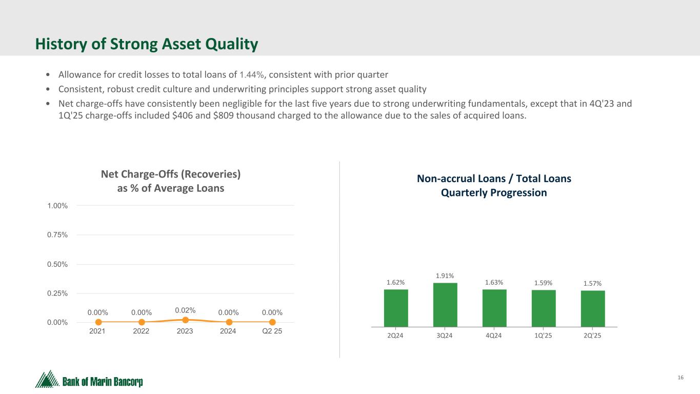 15 Text 95,96,96 Light Gray 232, 232, 232 Black 0, 0, 0 White 255, 255, 255 Accent 1 7,89,52 Accent 2 248,153,40 Accent 3 254,217,129 Accent 4 52,153,70 Accent 5 5,39,67 Accent 6 171,184,195 ($ in millions at Fair Value) * Loan-to-value largely based on appraised values at origination, or updated appraisals for certain high dollar loans and, balances as of 6/30/25 Construction Portfolio Concentrations As of 6/30/25 Construction by Type 2Q'25 Construction by County 2Q'25 Multi-Family 35% 1-4 Residential 65% San Francisco 64% Napa 16% Other Bay Area 8% Marin 12% Average Balance: $2.7MM Largest Loan: $6.7MM Wtd. Avg. LTV*: 59% Total Balance: $25.0MM Unfunded Commitments: $4.3MM Total Loans: 9 $25MM $25MM