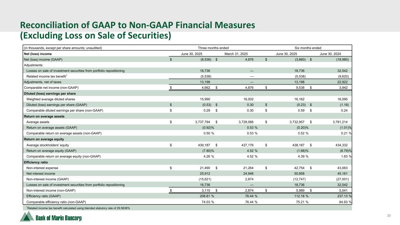 22 Text 95,96,96 Light Gray 232, 232, 232 Black 0, 0, 0 White 255, 255, 255 Accent 1 7,89,52 Accent 2 248,153,40 Accent 3 254,217,129 Accent 4 52,153,70 Accent 5 5,39,67 Accent 6 171,184,195 Reconciliation of GAAP to Non-GAAP Financial Measures (Excluding Loss on Sale of Securities) (in thousands; unaudited) Three months ended Six months ended Pre-tax, pre-provision net income June 30, 2025 March 31, 2025 June 30, 2025 June 30, 2024 (Loss) income before (benefit from) provision for income taxes $ (11,199) $ 6,481 $ (4,718) $ (30,453) Provision for credit losses on loans — 75 75 5,550 Pre-tax, pre-provision net income (GAAP) (11,199) 6,556 (4,643) (24,903) Adjustments: Losses on sale of investment securities from portfolio repositioning 18,736 — 18,736 32,542 Comparable pre-tax, pre-provision net income (non-GAAP) $ 7,537 $ 6,556 $ 14,093 $ 7,639