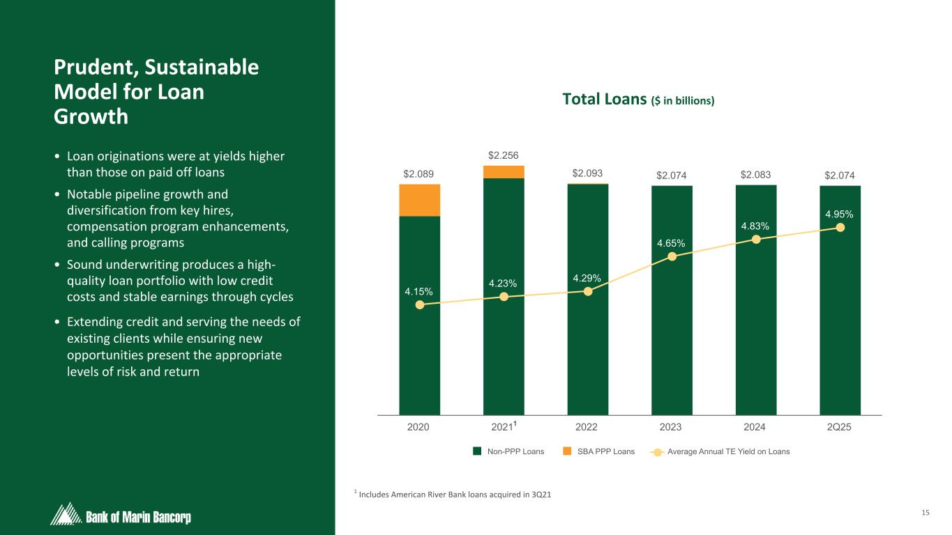 14 Text 95,96,96 Light Gray 232, 232, 232 Black 0, 0, 0 White 255, 255, 255 Accent 1 7,89,52 Accent 2 248,153,40 Accent 3 254,217,129 Accent 4 52,153,70 Accent 5 5,39,67 Accent 6 171,184,195 Strong Liquidity: $1.9 Billion in Net Availability • Immediately available contingent funding represented 200% of June 30, 2025 estimated uninsured and/or uncollateralized deposits • The Bank has long-established minimum liquidity requirements regularly monitored using metrics and tools similar to larger banks, such as the liquidity coverage ratio and multi-scenario, long-horizon stress tests • Deposit outflow assumptions for liquidity monitoring and stress testing are conservative relative to actual experience Liquidity & Uninsured Deposits ($ in millions) 2.0x Coverage Ratio At June 30, 2025 ($ in millions) Total Available Amount Used Net Availability Internal Sources Unrestricted Cash 1 $ 201.1 N/A $ 201.1 Unencumbered Securities 271.0 N/A 271.0 External Sources FHLB line of credit 946.0 — 946.0 FRB line of credit 319.8 — 319.8 Lines of credit at correspondent banks 125.0 — 125.0 Total Liquidity $ 1,862.9 $ — $ 1,862.9 1 Excludes cash items in transit Note: Access to brokered deposit purchases through networks such as Intrafi and Reich & Tang and brokered CD sales not included above $1,862.9 $933 Liquidity Est. Uninsured and/or Uncollateralized Deposits