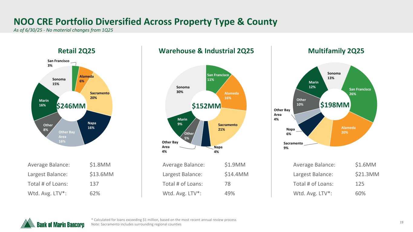 18 Text 95,96,96 Light Gray 232, 232, 232 Black 0, 0, 0 White 255, 255, 255 Accent 1 7,89,52 Accent 2 248,153,40 Accent 3 254,217,129 Accent 4 52,153,70 Accent 5 5,39,67 Accent 6 171,184,195 • $361 million in credit exposure spread across our lending footprint comprised of 147 loans • $2.5 million average loan balance – largest loan at $15.8 million • 64% weighted average loan-to-value and 1.62x weighted average debt-service coverage ratio* • City of San Francisco NOO CRE office exposure is 3% of total loan portfolio and 5% of total NOO CRE loans NOO CRE Office Portfolio by County * Calculated for loans exceeding $1 million, based on the most recent annual review process, and net of individual reserves Non-owner Occupied Office Exposure As of 6/30/25 - No material changes from 1Q25 San Francisco 17% Alameda 8% Sacramento 6% Napa 8% Other Bay Area 15%Other 4% Marin 24% Sonoma 18% $361MM City of S.F. NOO CRE Office Portfolio Total Balance: $61.1 million Average Loan Bal: $5.1 million Number of Loans: 12 loans Wtd. Average LTV*: 63% Wtd. Average DCR: 1.31x Average Occupancy: 81% 11 of the 12 loans are secured by low rise buildings and one loan is secured by a 10 story building