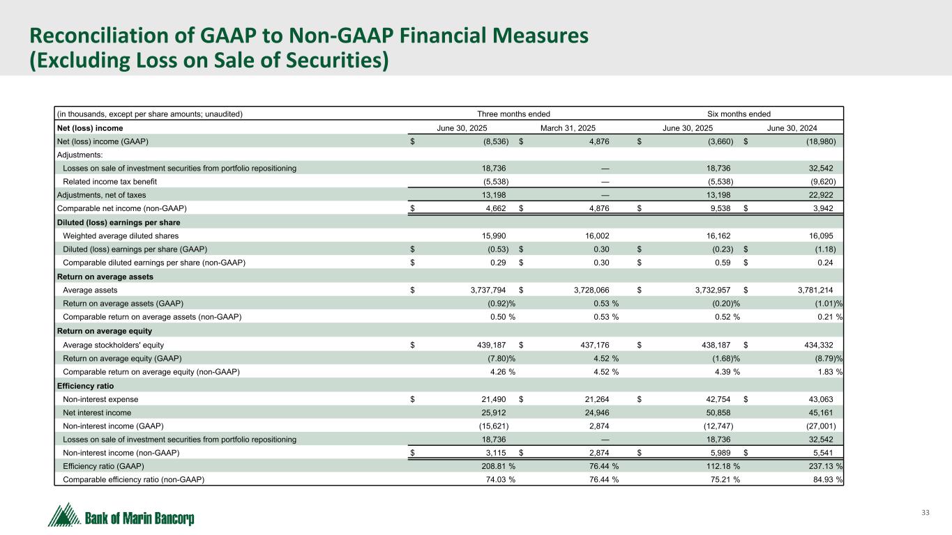 32 Text 95,96,96 Light Gray 232, 232, 232 Black 0, 0, 0 White 255, 255, 255 Accent 1 7,89,52 Accent 2 248,153,40 Accent 3 254,217,129 Accent 4 52,153,70 Accent 5 5,39,67 Accent 6 171,184,195 Reconciliation of GAAP to Non-GAAP Financial Measures (Excluding Loss on Sale of Securities) (in thousands; unaudited) Three months ended Six months ended Pre-tax, pre-provision net income June 30, 2025 March 31, 2025 June 30, 2025 June 30, 2024 (Loss) income before (benefit from) provision for income taxes $ (11,199) $ 6,481 $ (4,718) $ (30,453) Provision for credit losses on loans — 75 75 5,550 Pre-tax, pre-provision net income (GAAP) (11,199) 6,556 (4,643) (24,903) Adjustments: Losses on sale of investment securities from portfolio repositioning 18,736 — 18,736 32,542 Comparable pre-tax, pre-provision net income (non-GAAP) $ 7,537 $ 6,556 $ 14,093 $ 7,639