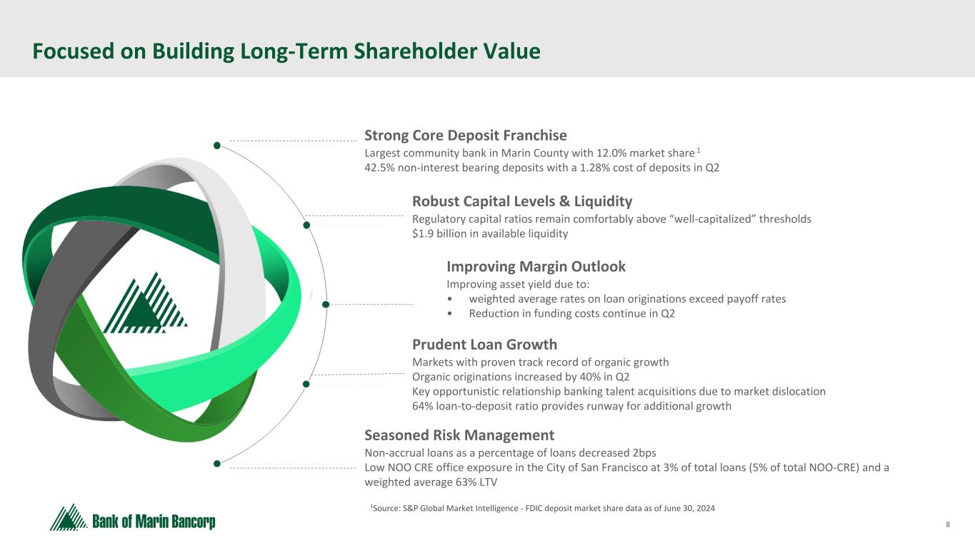 8 Text 95,96,96 Light Gray 232, 232, 232 Black 0, 0, 0 White 255, 255, 255 Accent 1 7,89,52 Accent 2 248,153,40 Accent 3 254,217,129 Accent 4 52,153,70 Accent 5 5,39,67 Accent 6 171,184,195 Focused on Building Long-Term Shareholder Value Strong Core Deposit Franchise Largest community bank in Marin County with 12.0% market share 1 42.5% non-interest bearing deposits with a 1.28% cost of deposits in Q2 Improving Margin Outlook Improving asset yield due to: • weighted average rates on loan originations exceed payoff rates • Reduction in funding costs continue in Q2 Seasoned Risk Management Non-accrual loans as a percentage of loans decreased 2bps Low NOO CRE office exposure in the City of San Francisco at 3% of total loans (5% of total NOO-CRE) and a weighted average 63% LTV Prudent Loan Growth Markets with proven track record of organic growth Organic originations increased by 40% in Q2 Key opportunistic relationship banking talent acquisitions due to market dislocation 64% loan-to-deposit ratio provides runway for additional growth Robust Capital Levels & Liquidity Regulatory capital ratios remain comfortably above “well-capitalized” thresholds $1.9 billion in available liquidity 1Source: S&P Global Market Intelligence - FDIC deposit market share data as of June 30, 2024