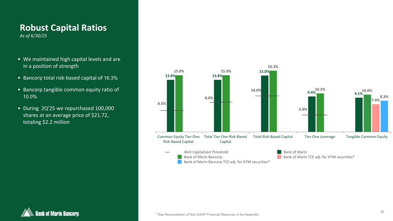 9 Text 95,96,96 Light Gray 232, 232, 232 Black 0, 0, 0 White 255, 255, 255 Accent 1 7,89,52 Accent 2 248,153,40 Accent 3 254,217,129 Accent 4 52,153,70 Accent 5 5,39,67 Accent 6 171,184,195 Focused on delivering Long-Term, Consistent Growth • Proven ability to grow both organically and through M&A • Consistent cash dividend provides stable and reliable return for shareholders Note: Tangible book value per share (TBVPS) equals total shareholders’ equity, less intangible assets including goodwill and core deposit intangibles, divided by outstanding common shares at period end. Accumulated other comprehensive income (AOCI) represents the unrealized gains (losses) on available-for-sale securities, net of tax. Components of these calculations were derived from our financial reports filed with the SEC for each respective period. Additional information for 2024 can be found in the Reconciliation of Non-GAAP Financial Measures in the Appendix. Tangible Book Value Per Share and Cumulative Cash Dividends $0.77 $1.22 $1.73 $2.29 $2.92 $3.72 $4.64 $5.58 $6.56 $7.56 $8.56 $9.06 $15.89 $16.87 $18.35 $18.99 $20.57 $21.91 $23.09 $23.42 $25.45 $25.72 $24.24 $23.44 Cumulative Cash Dividends TBVPS TBVPS (Excl AOCI) 2014 2015 2016 2017 2018 2019 2020 2021 2022 2023 2024 2Q25 $— $5.00 $10.00 $15.00 $20.00 $25.00 $30.00