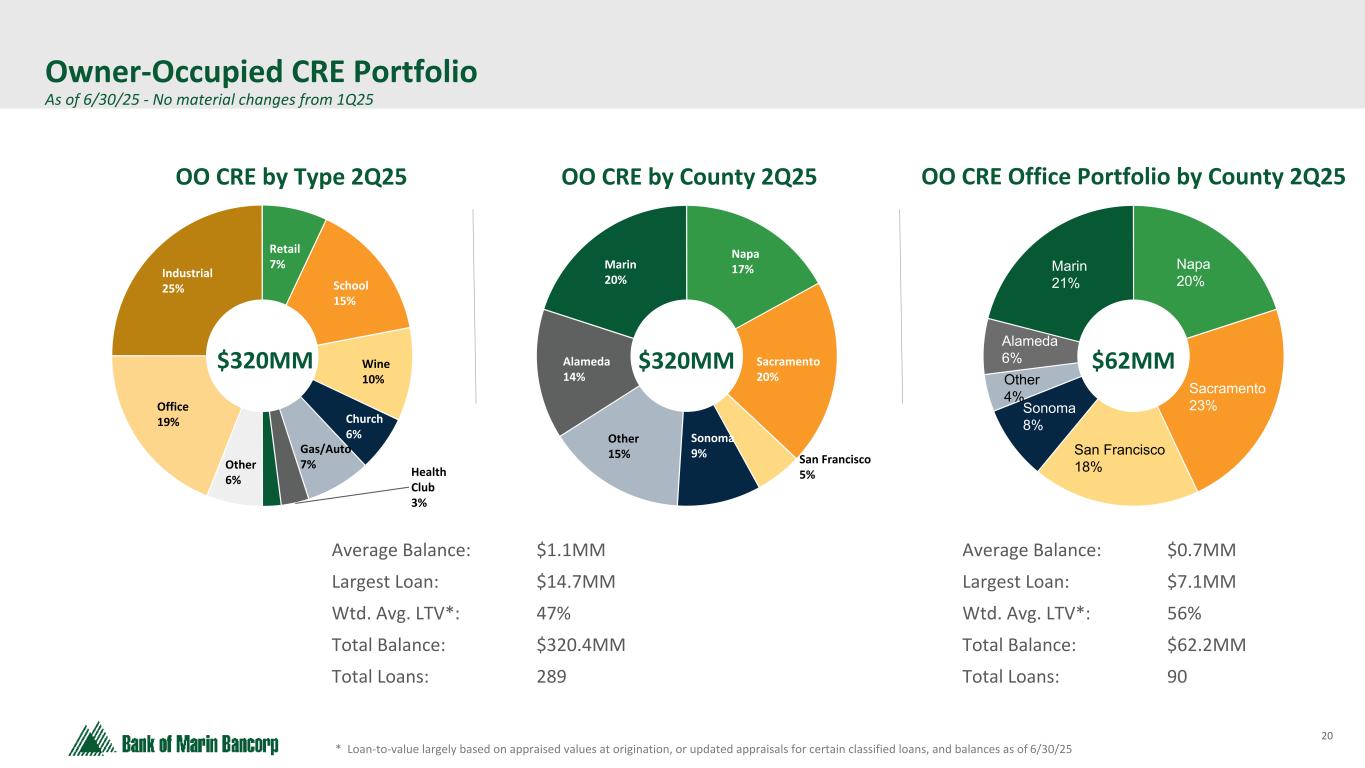 19 Text 95,96,96 Light Gray 232, 232, 232 Black 0, 0, 0 White 255, 255, 255 Accent 1 7,89,52 Accent 2 248,153,40 Accent 3 254,217,129 Accent 4 52,153,70 Accent 5 5,39,67 Accent 6 171,184,195 * Calculated for loans exceeding $1 million, based on the most recent annual review process Note: Sacramento includes surrounding regional counties NOO CRE Portfolio Diversified Across Property Type & County As of 6/30/25 - No material changes from 1Q25 Average Balance: $1.8MM Largest Balance: $13.6MM Total # of Loans: 137 Wtd. Avg. LTV*: 62% Average Balance: $1.9MM Largest Balance: $14.4MM Total # of Loans: 78 Wtd. Avg. LTV*: 49% Average Balance: $1.6MM Largest Balance: $21.3MM Total # of Loans: 125 Wtd. Avg. LTV*: 60% San Francisco 3% Alameda 6% Sacramento 20% Napa 16% Other Bay Area 16% Other 8% Marin 16% Sonoma 15% San Francisco 11% Alameda 16% Sacramento 21% Napa 4% Other Bay Area 4% Other 5% Marin 9% Sonoma 30% San Francisco 26% Alameda 20% Sacramento 9% Napa 6% Other Bay Area 4% Other 10% Marin 12% Sonoma 13% Retail 2Q25 Warehouse & Industrial 2Q25 Multifamily 2Q25 $246MM $152MM $198MM
