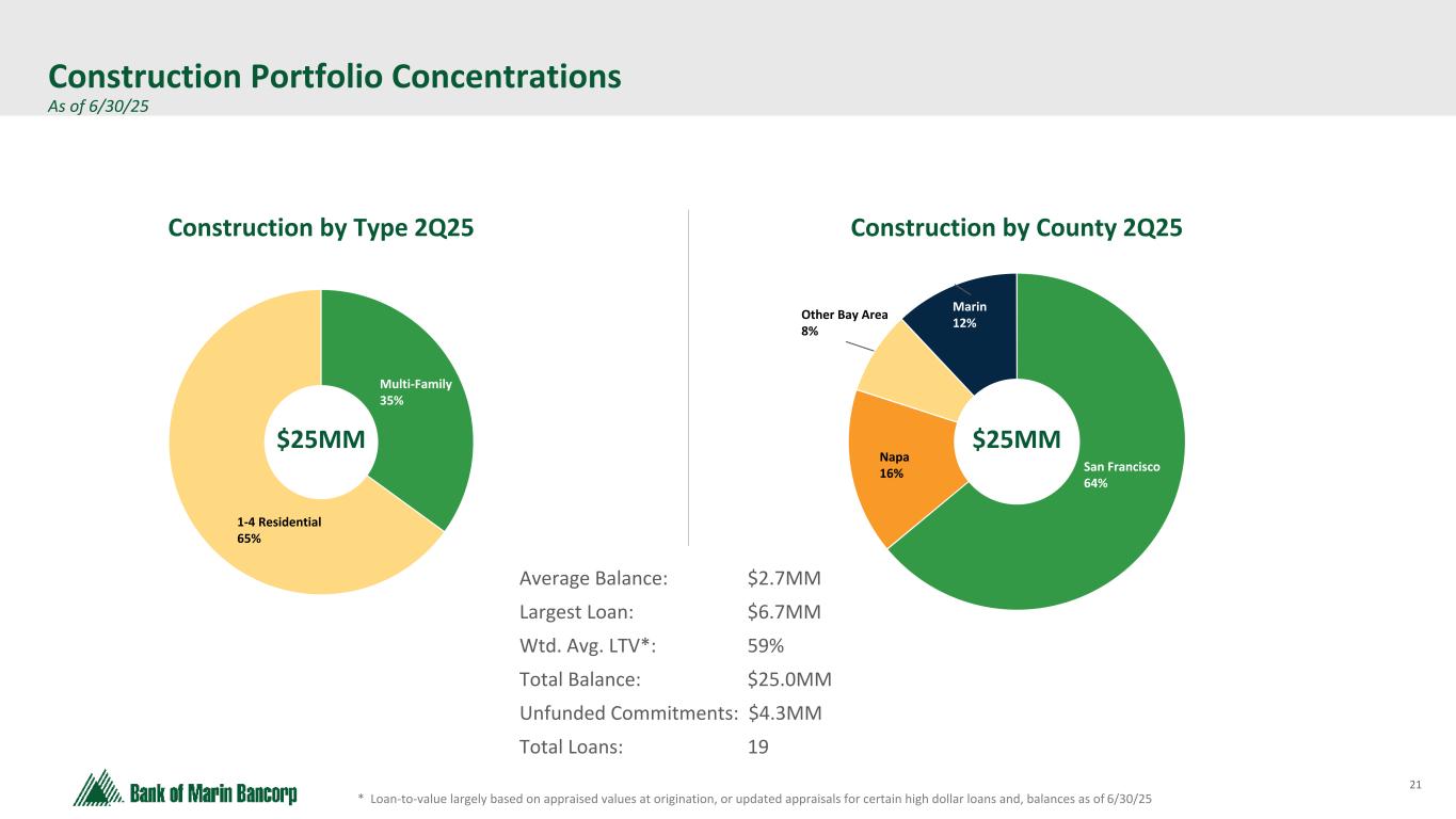 20 Text 95,96,96 Light Gray 232, 232, 232 Black 0, 0, 0 White 255, 255, 255 Accent 1 7,89,52 Accent 2 248,153,40 Accent 3 254,217,129 Accent 4 52,153,70 Accent 5 5,39,67 Accent 6 171,184,195 ($ in millions at Fair Value) * Loan-to-value largely based on appraised values at origination, or updated appraisals for certain classified loans, and balances as of 6/30/25 Owner-Occupied CRE Portfolio As of 6/30/25 - No material changes from 1Q25 Retail 7% School 15% Wine 10% Church 6% Gas/Auto 7% Health Club 3% Other 6% Office 19% Industrial 25% Napa 17% Sacramento 20% San Francisco 5% Sonoma 9% Other 15% Alameda 14% Marin 20% OO CRE by County 2Q25 Average Balance: $1.1MM Largest Loan: $14.7MM Wtd. Avg. LTV*: 47% Total Balance: $320.4MM Total Loans: 289 OO CRE by Type 2Q25 $320MM $320MM Napa 20% Sacramento 23% San Francisco 18% Sonoma 8% Other 4% Alameda 6% Marin 21% Average Balance: $0.7MM Largest Loan: $7.1MM Wtd. Avg. LTV*: 56% Total Balance: $62.2MM Total Loans: 90 OO CRE Office Portfolio by County 2Q25 $62MM