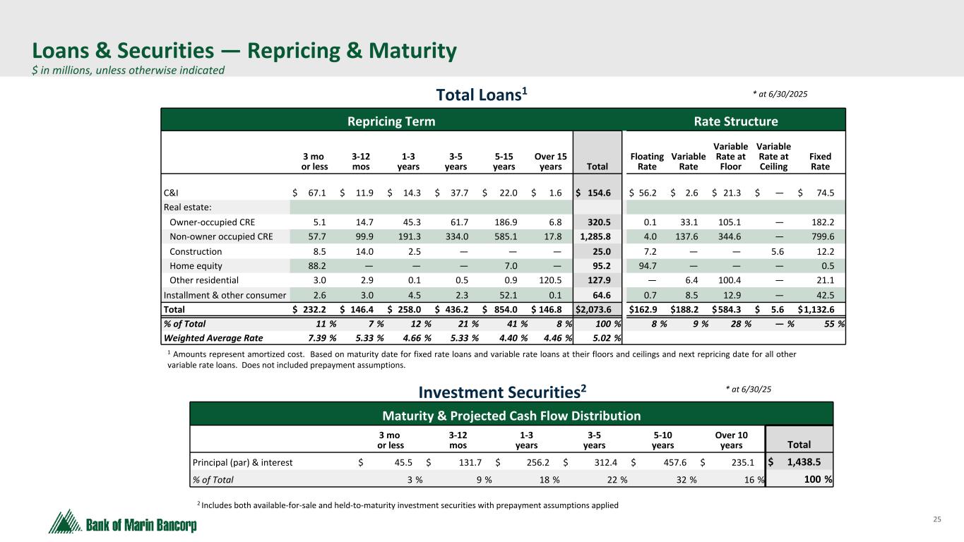 25 Text 95,96,96 Light Gray 232, 232, 232 Black 0, 0, 0 White 255, 255, 255 Accent 1 7,89,52 Accent 2 248,153,40 Accent 3 254,217,129 Accent 4 52,153,70 Accent 5 5,39,67 Accent 6 171,184,195 Loans & Securities — Repricing & Maturity $ in millions, unless otherwise indicated Total Loans1 * at 6/30/2025 Repricing Term Rate Structure 3 mo or less 3-12 mos 1-3 years 3-5 years 5-15 years Over 15 years Total Floating Rate Variable Rate Variable Rate at Floor Variable Rate at Ceiling Fixed Rate C&I $ 67.1 $ 11.9 $ 14.3 $ 37.7 $ 22.0 $ 1.6 $ 154.6 $ 56.2 $ 2.6 $ 21.3 $ — $ 74.5 Real estate: Owner-occupied CRE 5.1 14.7 45.3 61.7 186.9 6.8 320.5 0.1 33.1 105.1 — 182.2 Non-owner occupied CRE 57.7 99.9 191.3 334.0 585.1 17.8 1,285.8 4.0 137.6 344.6 — 799.6 Construction 8.5 14.0 2.5 — — — 25.0 7.2 — — 5.6 12.2 Home equity 88.2 — — — 7.0 — 95.2 94.7 — — — 0.5 Other residential 3.0 2.9 0.1 0.5 0.9 120.5 127.9 — 6.4 100.4 — 21.1 Installment & other consumer 2.6 3.0 4.5 2.3 52.1 0.1 64.6 0.7 8.5 12.9 — 42.5 Total $ 232.2 $ 146.4 $ 258.0 $ 436.2 $ 854.0 $ 146.8 $ 2,073.6 $ 162.9 $ 188.2 $ 584.3 $ 5.6 $ 1,132.6 % of Total 11 % 7 % 12 % 21 % 41 % 8 % 100 % 8 % 9 % 28 % — % 55 % Weighted Average Rate 7.39 % 5.33 % 4.66 % 5.33 % 4.40 % 4.46 % 5.02 % 1 Amounts represent amortized cost. Based on maturity date for fixed rate loans and variable rate loans at their floors and ceilings and next repricing date for all other variable rate loans. Does not included prepayment assumptions. Investment Securities2 * at 6/30/25 2 Includes both available-for-sale and held-to-maturity investment securities with prepayment assumptions applied Maturity & Projected Cash Flow Distribution 3 mo or less 3-12 mos 1-3 years 3-5 years 5-10 years Over 10 years Total Principal (par) & interest $ 45.5 $ 131.7 $ 256.2 $ 312.4 $ 457.6 $ 235.1 $ 1,438.5 % of Total 3 % 9 % 18 % 22 % 32 % 16 % 100 %