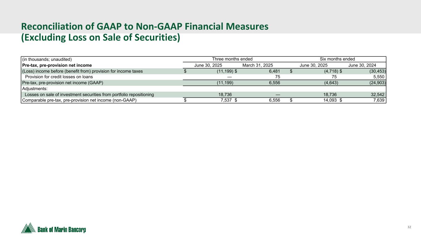 32 Text 95,96,96 Light Gray 232, 232, 232 Black 0, 0, 0 White 255, 255, 255 Accent 1 7,89,52 Accent 2 248,153,40 Accent 3 254,217,129 Accent 4 52,153,70 Accent 5 5,39,67 Accent 6 171,184,195 Reconciliation of GAAP to Non-GAAP Financial Measures (Excluding Loss on Sale of Securities) (in thousands; unaudited) Three months ended Six months ended Pre-tax, pre-provision net income June 30, 2025 March 31, 2025 June 30, 2025 June 30, 2024 (Loss) income before (benefit from) provision for income taxes $ (11,199) $ 6,481 $ (4,718) $ (30,453) Provision for credit losses on loans — 75 75 5,550 Pre-tax, pre-provision net income (GAAP) (11,199) 6,556 (4,643) (24,903) Adjustments: Losses on sale of investment securities from portfolio repositioning 18,736 — 18,736 32,542 Comparable pre-tax, pre-provision net income (non-GAAP) $ 7,537 $ 6,556 $ 14,093 $ 7,639