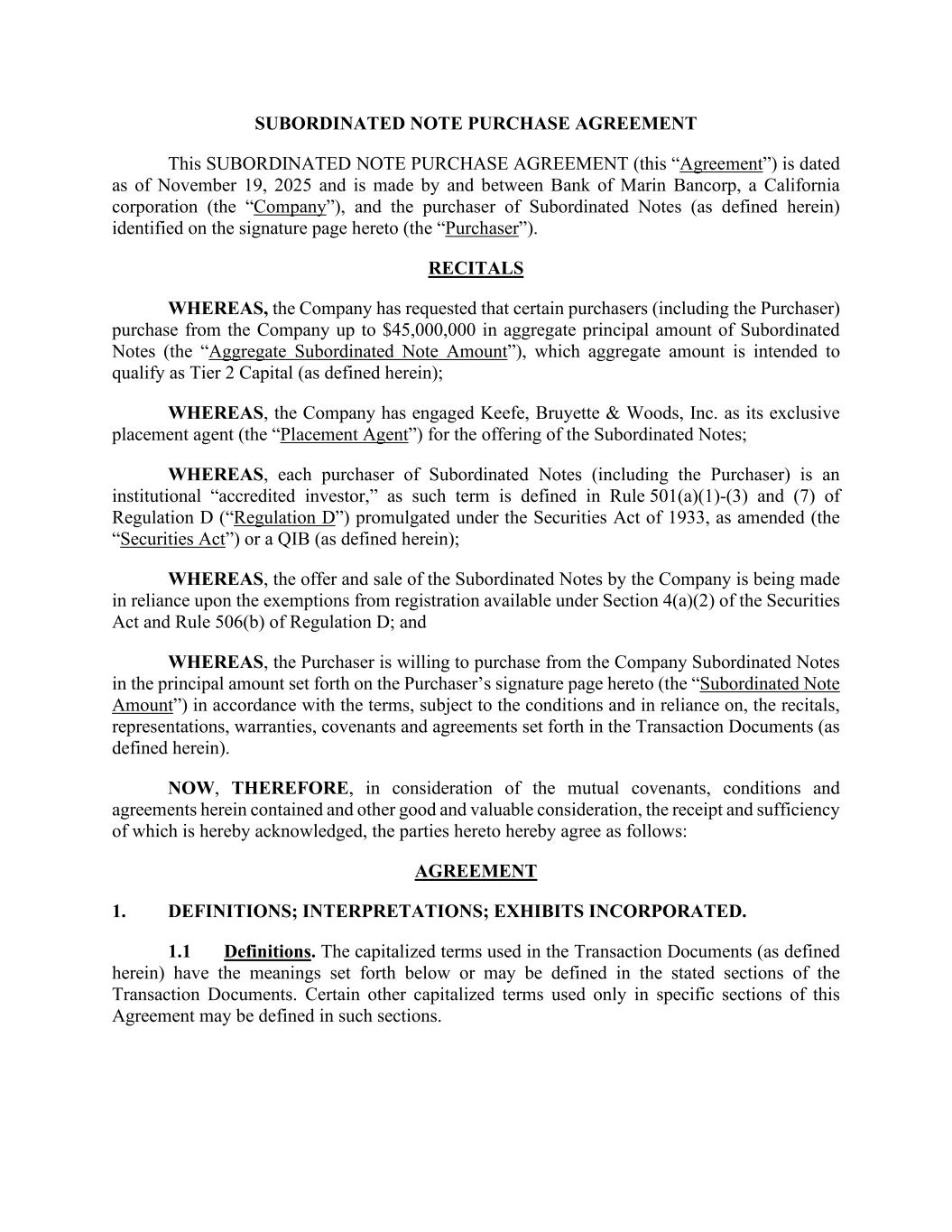 SUBORDINATED NOTE PURCHASE AGREEMENT This SUBORDINATED NOTE PURCHASE AGREEMENT (this “Agreement”) is dated as of November 19, 2025 and is made by and between Bank of Marin Bancorp, a California corporation (the “Company”), and the purchaser of Subordinated Notes (as defined herein) identified on the signature page hereto (the “Purchaser”). RECITALS WHEREAS, the Company has requested that certain purchasers (including the Purchaser) purchase from the Company up to $45,000,000 in aggregate principal amount of Subordinated Notes (the “Aggregate Subordinated Note Amount”), which aggregate amount is intended to qualify as Tier 2 Capital (as defined herein); WHEREAS, the Company has engaged Keefe, Bruyette & Woods, Inc. as its exclusive placement agent (the “Placement Agent”) for the offering of the Subordinated Notes; WHEREAS, each purchaser of Subordinated Notes (including the Purchaser) is an institutional “accredited investor,” as such term is defined in Rule 501(a)(1)-(3) and (7) of Regulation D (“Regulation D”) promulgated under the Securities Act of 1933, as amended (the “Securities Act”) or a QIB (as defined herein); WHEREAS, the offer and sale of the Subordinated Notes by the Company is being made in reliance upon the exemptions from registration available under Section 4(a)(2) of the Securities Act and Rule 506(b) of Regulation D; and WHEREAS, the Purchaser is willing to purchase from the Company Subordinated Notes in the principal amount set forth on the Purchaser’s signature page hereto (the “Subordinated Note Amount”) in accordance with the terms, subject to the conditions and in reliance on, the recitals, representations, warranties, covenants and agreements set forth in the Transaction Documents (as defined herein). NOW, THEREFORE, in consideration of the mutual covenants, conditions and agreements herein contained and other good and valuable consideration, the receipt and sufficiency of which is hereby acknowledged, the parties hereto hereby agree as follows: AGREEMENT 1. DEFINITIONS; INTERPRETATIONS; EXHIBITS INCORPORATED. 1.1 Definitions. The capitalized terms used in the Transaction Documents (as defined herein) have the meanings set forth below or may be defined in the stated sections of the Transaction Documents. Certain other capitalized terms used only in specific sections of this Agreement may be defined in such sections.