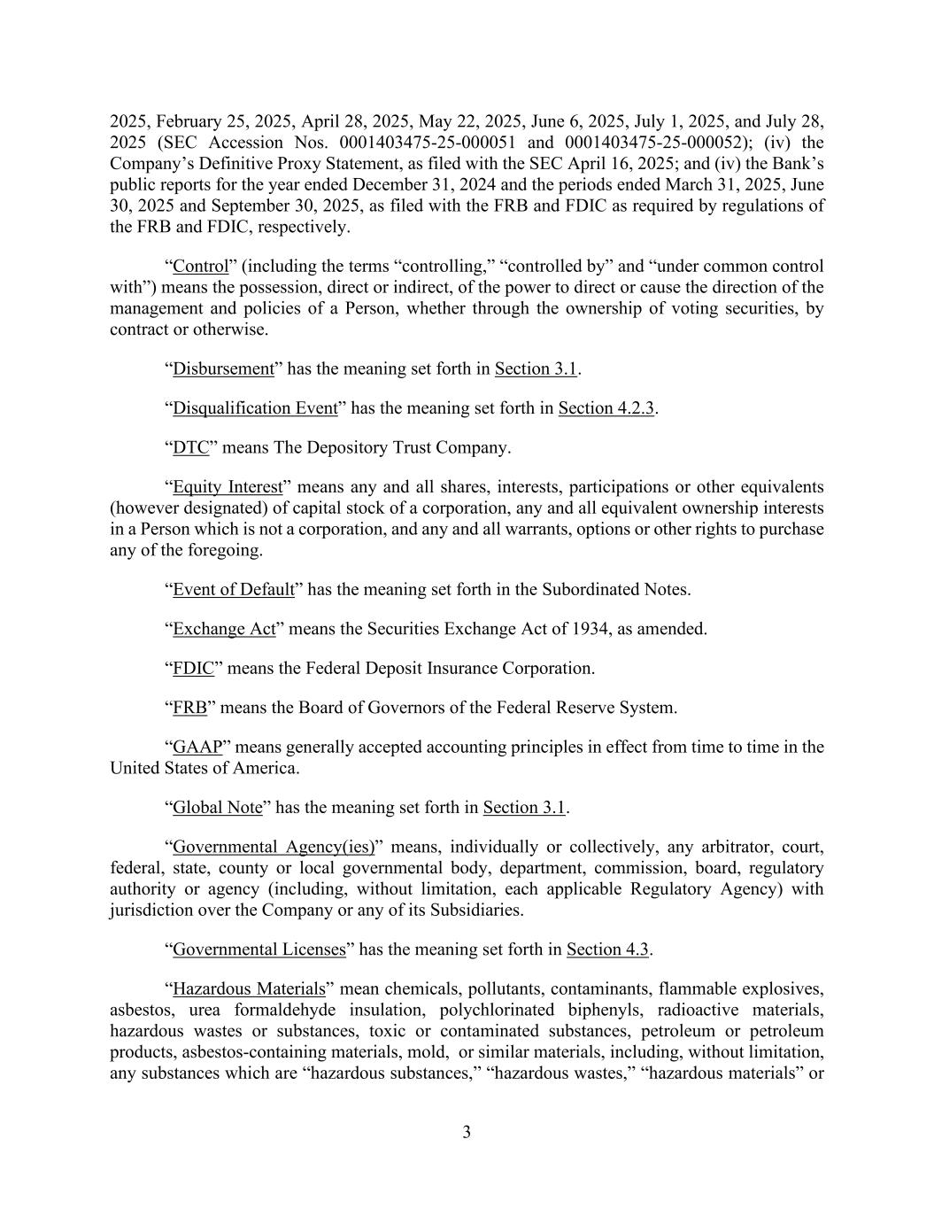 3 2025, February 25, 2025, April 28, 2025, May 22, 2025, June 6, 2025, July 1, 2025, and July 28, 2025 (SEC Accession Nos. 0001403475-25-000051 and 0001403475-25-000052); (iv) the Company’s Definitive Proxy Statement, as filed with the SEC April 16, 2025; and (iv) the Bank’s public reports for the year ended December 31, 2024 and the periods ended March 31, 2025, June 30, 2025 and September 30, 2025, as filed with the FRB and FDIC as required by regulations of the FRB and FDIC, respectively. “Control” (including the terms “controlling,” “controlled by” and “under common control with”) means the possession, direct or indirect, of the power to direct or cause the direction of the management and policies of a Person, whether through the ownership of voting securities, by contract or otherwise. “Disbursement” has the meaning set forth in Section 3.1. “Disqualification Event” has the meaning set forth in Section 4.2.3. “DTC” means The Depository Trust Company. “Equity Interest” means any and all shares, interests, participations or other equivalents (however designated) of capital stock of a corporation, any and all equivalent ownership interests in a Person which is not a corporation, and any and all warrants, options or other rights to purchase any of the foregoing. “Event of Default” has the meaning set forth in the Subordinated Notes. “Exchange Act” means the Securities Exchange Act of 1934, as amended. “FDIC” means the Federal Deposit Insurance Corporation. “FRB” means the Board of Governors of the Federal Reserve System. “GAAP” means generally accepted accounting principles in effect from time to time in the United States of America. “Global Note” has the meaning set forth in Section 3.1. “Governmental Agency(ies)” means, individually or collectively, any arbitrator, court, federal, state, county or local governmental body, department, commission, board, regulatory authority or agency (including, without limitation, each applicable Regulatory Agency) with jurisdiction over the Company or any of its Subsidiaries. “Governmental Licenses” has the meaning set forth in Section 4.3. “Hazardous Materials” mean chemicals, pollutants, contaminants, flammable explosives, asbestos, urea formaldehyde insulation, polychlorinated biphenyls, radioactive materials, hazardous wastes or substances, toxic or contaminated substances, petroleum or petroleum products, asbestos-containing materials, mold, or similar materials, including, without limitation, any substances which are “hazardous substances,” “hazardous wastes,” “hazardous materials” or
