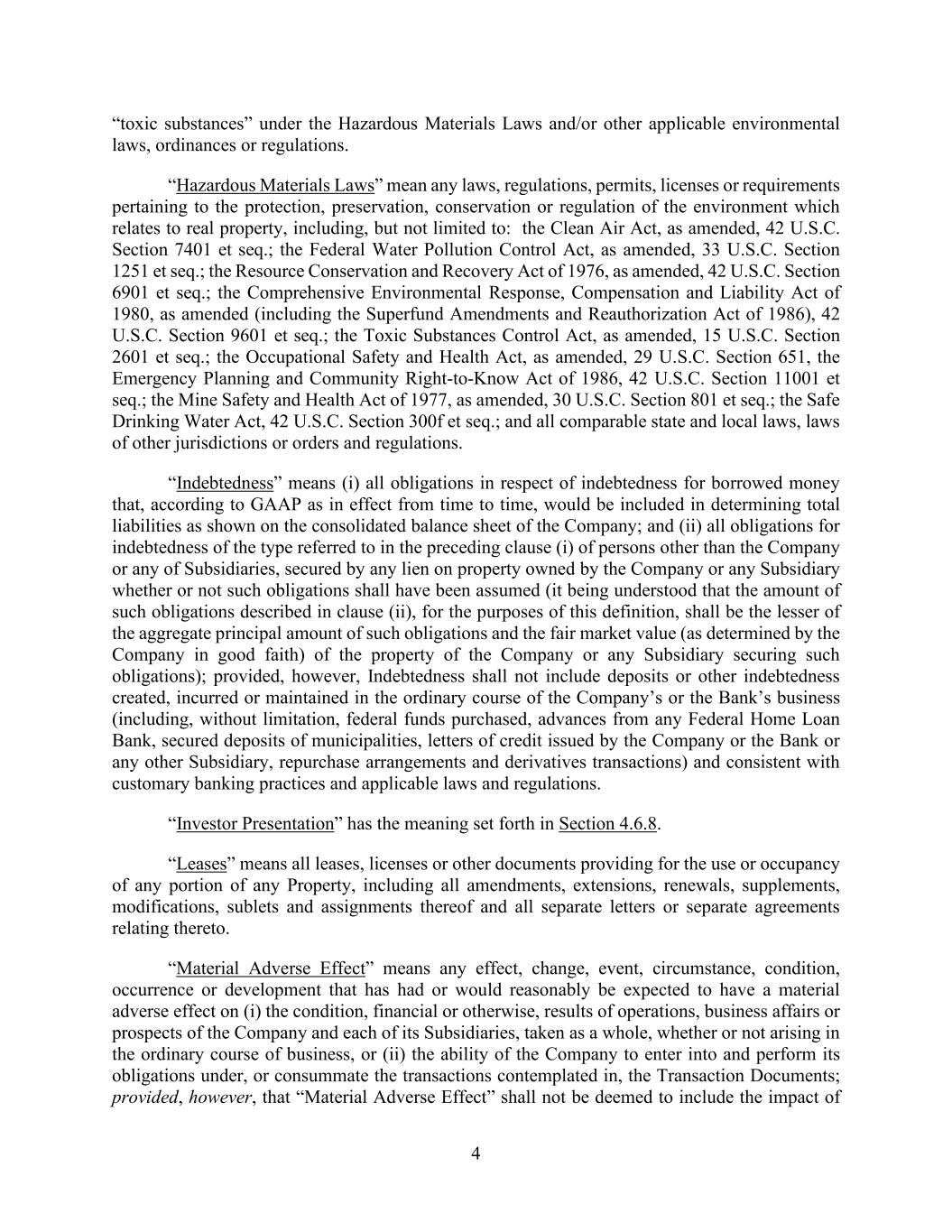 4 “toxic substances” under the Hazardous Materials Laws and/or other applicable environmental laws, ordinances or regulations. “Hazardous Materials Laws” mean any laws, regulations, permits, licenses or requirements pertaining to the protection, preservation, conservation or regulation of the environment which relates to real property, including, but not limited to: the Clean Air Act, as amended, 42 U.S.C. Section 7401 et seq.; the Federal Water Pollution Control Act, as amended, 33 U.S.C. Section 1251 et seq.; the Resource Conservation and Recovery Act of 1976, as amended, 42 U.S.C. Section 6901 et seq.; the Comprehensive Environmental Response, Compensation and Liability Act of 1980, as amended (including the Superfund Amendments and Reauthorization Act of 1986), 42 U.S.C. Section 9601 et seq.; the Toxic Substances Control Act, as amended, 15 U.S.C. Section 2601 et seq.; the Occupational Safety and Health Act, as amended, 29 U.S.C. Section 651, the Emergency Planning and Community Right-to-Know Act of 1986, 42 U.S.C. Section 11001 et seq.; the Mine Safety and Health Act of 1977, as amended, 30 U.S.C. Section 801 et seq.; the Safe Drinking Water Act, 42 U.S.C. Section 300f et seq.; and all comparable state and local laws, laws of other jurisdictions or orders and regulations. “Indebtedness” means (i) all obligations in respect of indebtedness for borrowed money that, according to GAAP as in effect from time to time, would be included in determining total liabilities as shown on the consolidated balance sheet of the Company; and (ii) all obligations for indebtedness of the type referred to in the preceding clause (i) of persons other than the Company or any of Subsidiaries, secured by any lien on property owned by the Company or any Subsidiary whether or not such obligations shall have been assumed (it being understood that the amount of such obligations described in clause (ii), for the purposes of this definition, shall be the lesser of the aggregate principal amount of such obligations and the fair market value (as determined by the Company in good faith) of the property of the Company or any Subsidiary securing such obligations); provided, however, Indebtedness shall not include deposits or other indebtedness created, incurred or maintained in the ordinary course of the Company’s or the Bank’s business (including, without limitation, federal funds purchased, advances from any Federal Home Loan Bank, secured deposits of municipalities, letters of credit issued by the Company or the Bank or any other Subsidiary, repurchase arrangements and derivatives transactions) and consistent with customary banking practices and applicable laws and regulations. “Investor Presentation” has the meaning set forth in Section 4.6.8. “Leases” means all leases, licenses or other documents providing for the use or occupancy of any portion of any Property, including all amendments, extensions, renewals, supplements, modifications, sublets and assignments thereof and all separate letters or separate agreements relating thereto. “Material Adverse Effect” means any effect, change, event, circumstance, condition, occurrence or development that has had or would reasonably be expected to have a material adverse effect on (i) the condition, financial or otherwise, results of operations, business affairs or prospects of the Company and each of its Subsidiaries, taken as a whole, whether or not arising in the ordinary course of business, or (ii) the ability of the Company to enter into and perform its obligations under, or consummate the transactions contemplated in, the Transaction Documents; provided, however, that “Material Adverse Effect” shall not be deemed to include the impact of