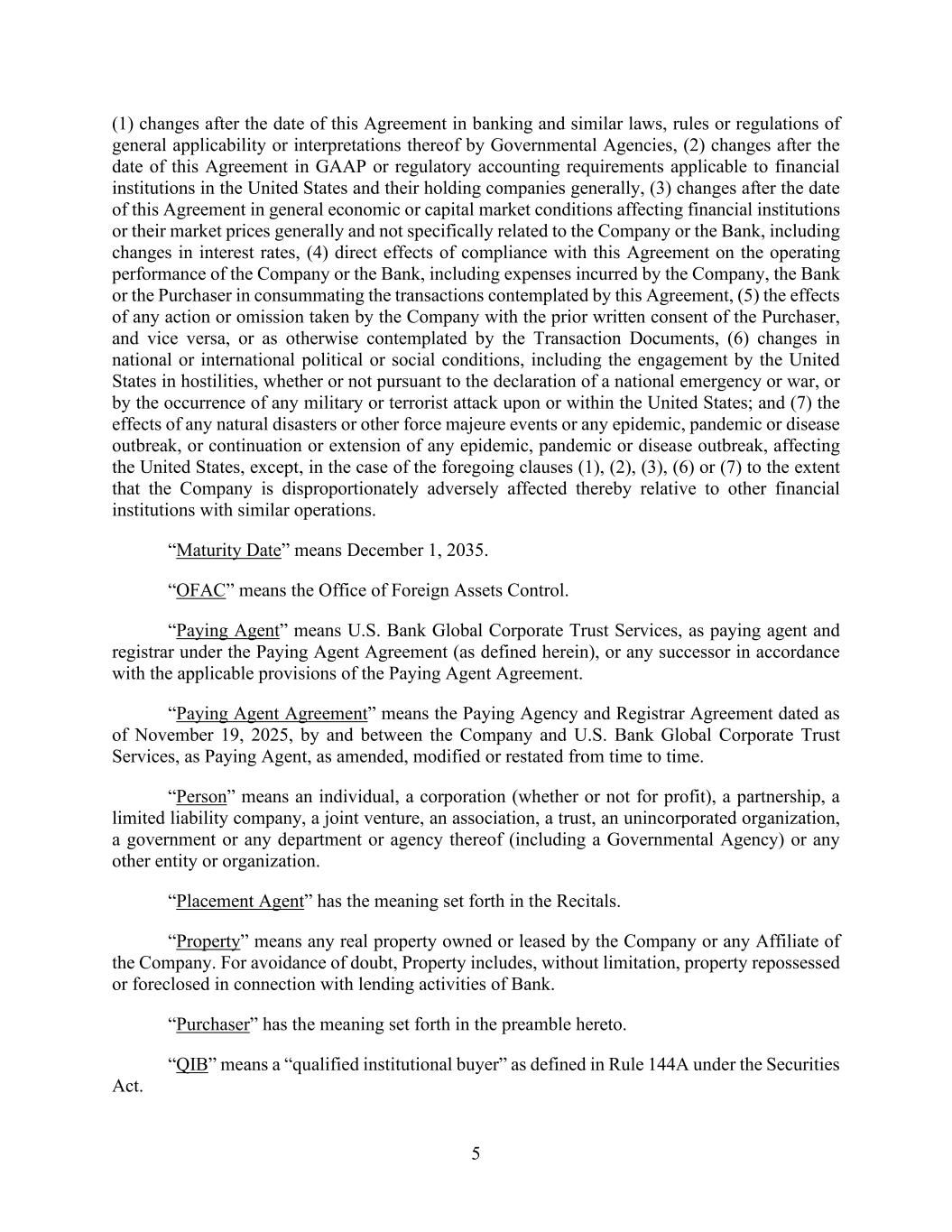 5 (1) changes after the date of this Agreement in banking and similar laws, rules or regulations of general applicability or interpretations thereof by Governmental Agencies, (2) changes after the date of this Agreement in GAAP or regulatory accounting requirements applicable to financial institutions in the United States and their holding companies generally, (3) changes after the date of this Agreement in general economic or capital market conditions affecting financial institutions or their market prices generally and not specifically related to the Company or the Bank, including changes in interest rates, (4) direct effects of compliance with this Agreement on the operating performance of the Company or the Bank, including expenses incurred by the Company, the Bank or the Purchaser in consummating the transactions contemplated by this Agreement, (5) the effects of any action or omission taken by the Company with the prior written consent of the Purchaser, and vice versa, or as otherwise contemplated by the Transaction Documents, (6) changes in national or international political or social conditions, including the engagement by the United States in hostilities, whether or not pursuant to the declaration of a national emergency or war, or by the occurrence of any military or terrorist attack upon or within the United States; and (7) the effects of any natural disasters or other force majeure events or any epidemic, pandemic or disease outbreak, or continuation or extension of any epidemic, pandemic or disease outbreak, affecting the United States, except, in the case of the foregoing clauses (1), (2), (3), (6) or (7) to the extent that the Company is disproportionately adversely affected thereby relative to other financial institutions with similar operations. “Maturity Date” means December 1, 2035. “OFAC” means the Office of Foreign Assets Control. “Paying Agent” means U.S. Bank Global Corporate Trust Services, as paying agent and registrar under the Paying Agent Agreement (as defined herein), or any successor in accordance with the applicable provisions of the Paying Agent Agreement. “Paying Agent Agreement” means the Paying Agency and Registrar Agreement dated as of November 19, 2025, by and between the Company and U.S. Bank Global Corporate Trust Services, as Paying Agent, as amended, modified or restated from time to time. “Person” means an individual, a corporation (whether or not for profit), a partnership, a limited liability company, a joint venture, an association, a trust, an unincorporated organization, a government or any department or agency thereof (including a Governmental Agency) or any other entity or organization. “Placement Agent” has the meaning set forth in the Recitals. “Property” means any real property owned or leased by the Company or any Affiliate of the Company. For avoidance of doubt, Property includes, without limitation, property repossessed or foreclosed in connection with lending activities of Bank. “Purchaser” has the meaning set forth in the preamble hereto. “QIB” means a “qualified institutional buyer” as defined in Rule 144A under the Securities Act.