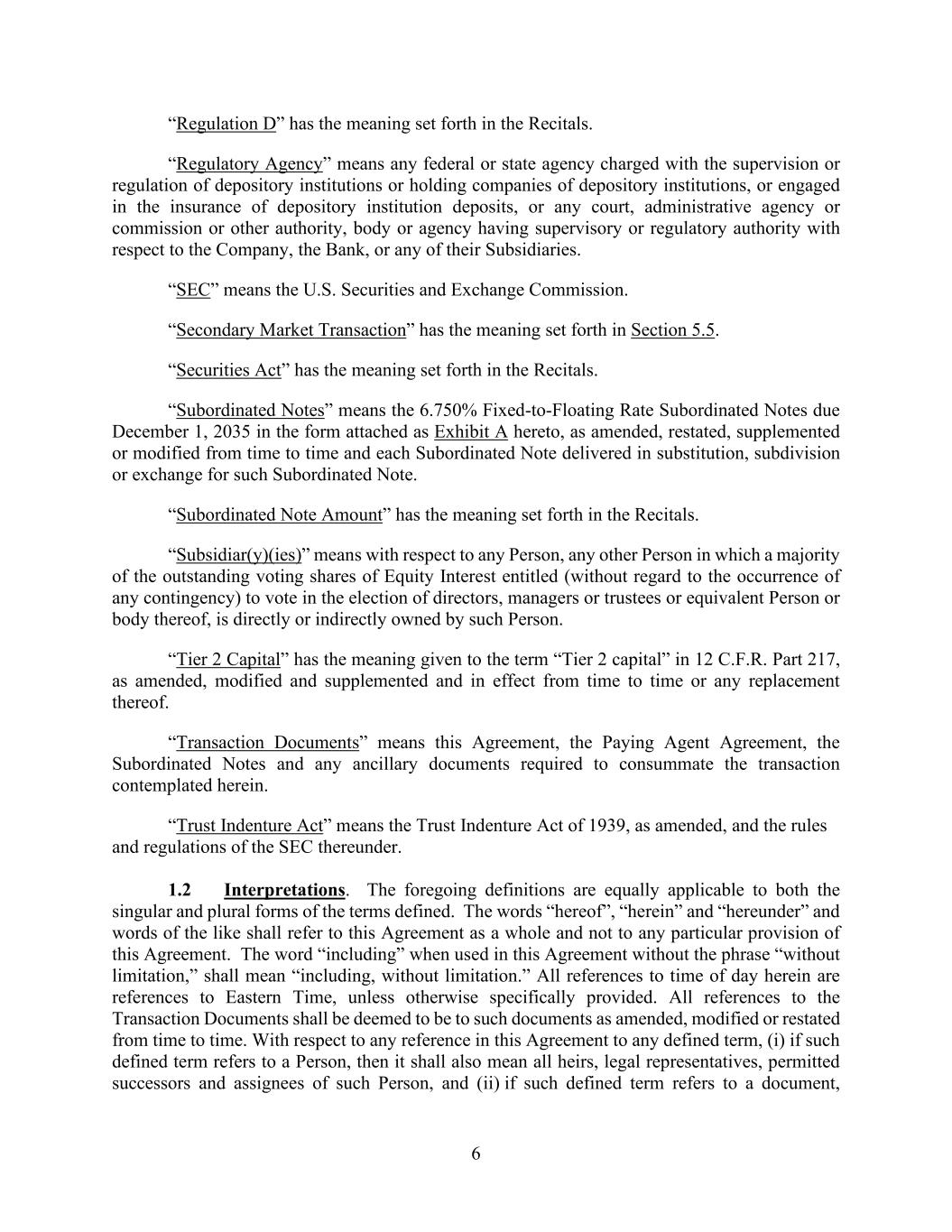 6 “Regulation D” has the meaning set forth in the Recitals. “Regulatory Agency” means any federal or state agency charged with the supervision or regulation of depository institutions or holding companies of depository institutions, or engaged in the insurance of depository institution deposits, or any court, administrative agency or commission or other authority, body or agency having supervisory or regulatory authority with respect to the Company, the Bank, or any of their Subsidiaries. “SEC” means the U.S. Securities and Exchange Commission. “Secondary Market Transaction” has the meaning set forth in Section 5.5. “Securities Act” has the meaning set forth in the Recitals. “Subordinated Notes” means the 6.750% Fixed-to-Floating Rate Subordinated Notes due December 1, 2035 in the form attached as Exhibit A hereto, as amended, restated, supplemented or modified from time to time and each Subordinated Note delivered in substitution, subdivision or exchange for such Subordinated Note. “Subordinated Note Amount” has the meaning set forth in the Recitals. “Subsidiar(y)(ies)” means with respect to any Person, any other Person in which a majority of the outstanding voting shares of Equity Interest entitled (without regard to the occurrence of any contingency) to vote in the election of directors, managers or trustees or equivalent Person or body thereof, is directly or indirectly owned by such Person. “Tier 2 Capital” has the meaning given to the term “Tier 2 capital” in 12 C.F.R. Part 217, as amended, modified and supplemented and in effect from time to time or any replacement thereof. “Transaction Documents” means this Agreement, the Paying Agent Agreement, the Subordinated Notes and any ancillary documents required to consummate the transaction contemplated herein. “Trust Indenture Act” means the Trust Indenture Act of 1939, as amended, and the rules and regulations of the SEC thereunder. 1.2 Interpretations. The foregoing definitions are equally applicable to both the singular and plural forms of the terms defined. The words “hereof”, “herein” and “hereunder” and words of the like shall refer to this Agreement as a whole and not to any particular provision of this Agreement. The word “including” when used in this Agreement without the phrase “without limitation,” shall mean “including, without limitation.” All references to time of day herein are references to Eastern Time, unless otherwise specifically provided. All references to the Transaction Documents shall be deemed to be to such documents as amended, modified or restated from time to time. With respect to any reference in this Agreement to any defined term, (i) if such defined term refers to a Person, then it shall also mean all heirs, legal representatives, permitted successors and assignees of such Person, and (ii) if such defined term refers to a document,