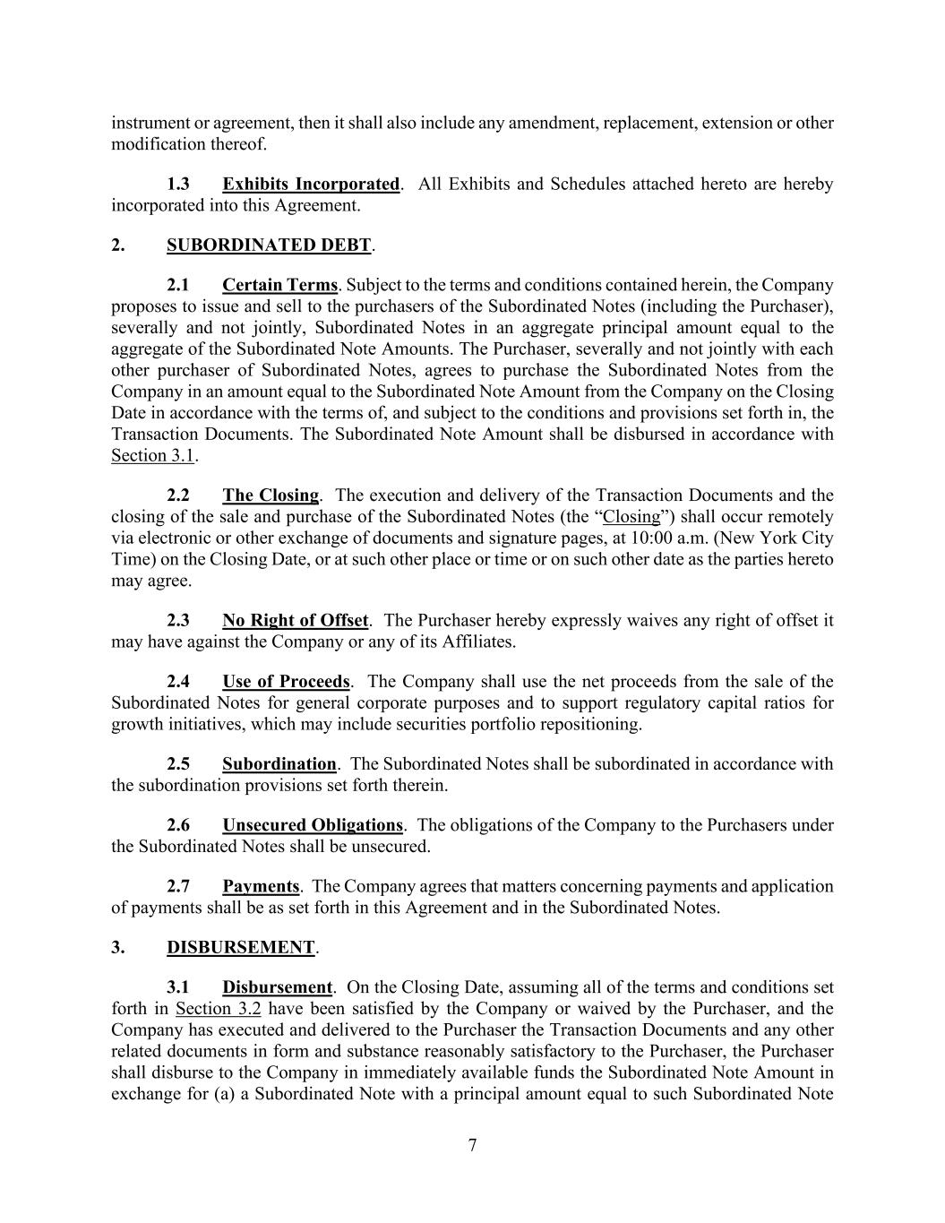 7 instrument or agreement, then it shall also include any amendment, replacement, extension or other modification thereof. 1.3 Exhibits Incorporated. All Exhibits and Schedules attached hereto are hereby incorporated into this Agreement. 2. SUBORDINATED DEBT. 2.1 Certain Terms. Subject to the terms and conditions contained herein, the Company proposes to issue and sell to the purchasers of the Subordinated Notes (including the Purchaser), severally and not jointly, Subordinated Notes in an aggregate principal amount equal to the aggregate of the Subordinated Note Amounts. The Purchaser, severally and not jointly with each other purchaser of Subordinated Notes, agrees to purchase the Subordinated Notes from the Company in an amount equal to the Subordinated Note Amount from the Company on the Closing Date in accordance with the terms of, and subject to the conditions and provisions set forth in, the Transaction Documents. The Subordinated Note Amount shall be disbursed in accordance with Section 3.1. 2.2 The Closing. The execution and delivery of the Transaction Documents and the closing of the sale and purchase of the Subordinated Notes (the “Closing”) shall occur remotely via electronic or other exchange of documents and signature pages, at 10:00 a.m. (New York City Time) on the Closing Date, or at such other place or time or on such other date as the parties hereto may agree. 2.3 No Right of Offset. The Purchaser hereby expressly waives any right of offset it may have against the Company or any of its Affiliates. 2.4 Use of Proceeds. The Company shall use the net proceeds from the sale of the Subordinated Notes for general corporate purposes and to support regulatory capital ratios for growth initiatives, which may include securities portfolio repositioning. 2.5 Subordination. The Subordinated Notes shall be subordinated in accordance with the subordination provisions set forth therein. 2.6 Unsecured Obligations. The obligations of the Company to the Purchasers under the Subordinated Notes shall be unsecured. 2.7 Payments. The Company agrees that matters concerning payments and application of payments shall be as set forth in this Agreement and in the Subordinated Notes. 3. DISBURSEMENT. 3.1 Disbursement. On the Closing Date, assuming all of the terms and conditions set forth in Section 3.2 have been satisfied by the Company or waived by the Purchaser, and the Company has executed and delivered to the Purchaser the Transaction Documents and any other related documents in form and substance reasonably satisfactory to the Purchaser, the Purchaser shall disburse to the Company in immediately available funds the Subordinated Note Amount in exchange for (a) a Subordinated Note with a principal amount equal to such Subordinated Note