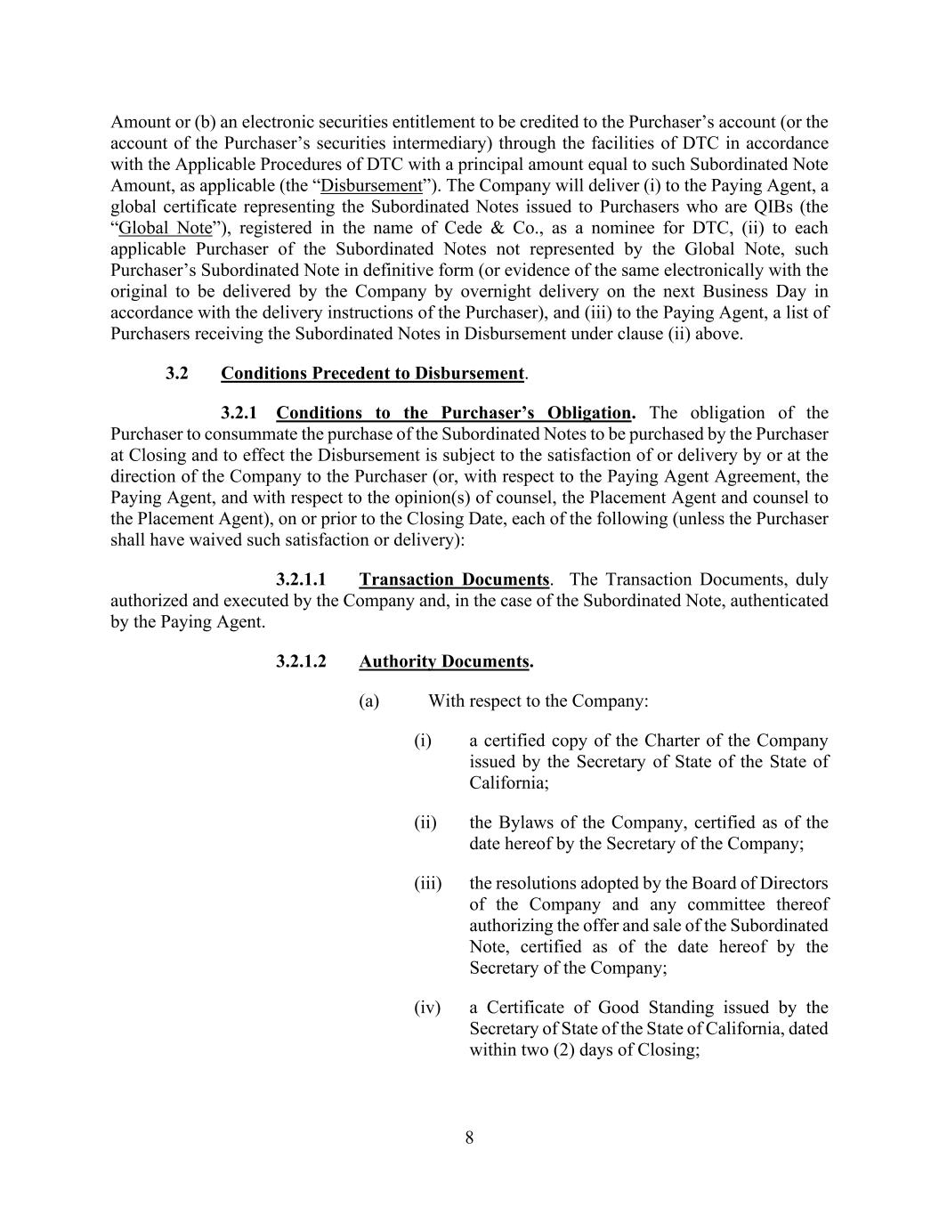 8 Amount or (b) an electronic securities entitlement to be credited to the Purchaser’s account (or the account of the Purchaser’s securities intermediary) through the facilities of DTC in accordance with the Applicable Procedures of DTC with a principal amount equal to such Subordinated Note Amount, as applicable (the “Disbursement”). The Company will deliver (i) to the Paying Agent, a global certificate representing the Subordinated Notes issued to Purchasers who are QIBs (the “Global Note”), registered in the name of Cede & Co., as a nominee for DTC, (ii) to each applicable Purchaser of the Subordinated Notes not represented by the Global Note, such Purchaser’s Subordinated Note in definitive form (or evidence of the same electronically with the original to be delivered by the Company by overnight delivery on the next Business Day in accordance with the delivery instructions of the Purchaser), and (iii) to the Paying Agent, a list of Purchasers receiving the Subordinated Notes in Disbursement under clause (ii) above. 3.2 Conditions Precedent to Disbursement. 3.2.1 Conditions to the Purchaser’s Obligation. The obligation of the Purchaser to consummate the purchase of the Subordinated Notes to be purchased by the Purchaser at Closing and to effect the Disbursement is subject to the satisfaction of or delivery by or at the direction of the Company to the Purchaser (or, with respect to the Paying Agent Agreement, the Paying Agent, and with respect to the opinion(s) of counsel, the Placement Agent and counsel to the Placement Agent), on or prior to the Closing Date, each of the following (unless the Purchaser shall have waived such satisfaction or delivery): 3.2.1.1 Transaction Documents. The Transaction Documents, duly authorized and executed by the Company and, in the case of the Subordinated Note, authenticated by the Paying Agent. 3.2.1.2 Authority Documents. (a) With respect to the Company: (i) a certified copy of the Charter of the Company issued by the Secretary of State of the State of California; (ii) the Bylaws of the Company, certified as of the date hereof by the Secretary of the Company; (iii) the resolutions adopted by the Board of Directors of the Company and any committee thereof authorizing the offer and sale of the Subordinated Note, certified as of the date hereof by the Secretary of the Company; (iv) a Certificate of Good Standing issued by the Secretary of State of the State of California, dated within two (2) days of Closing;