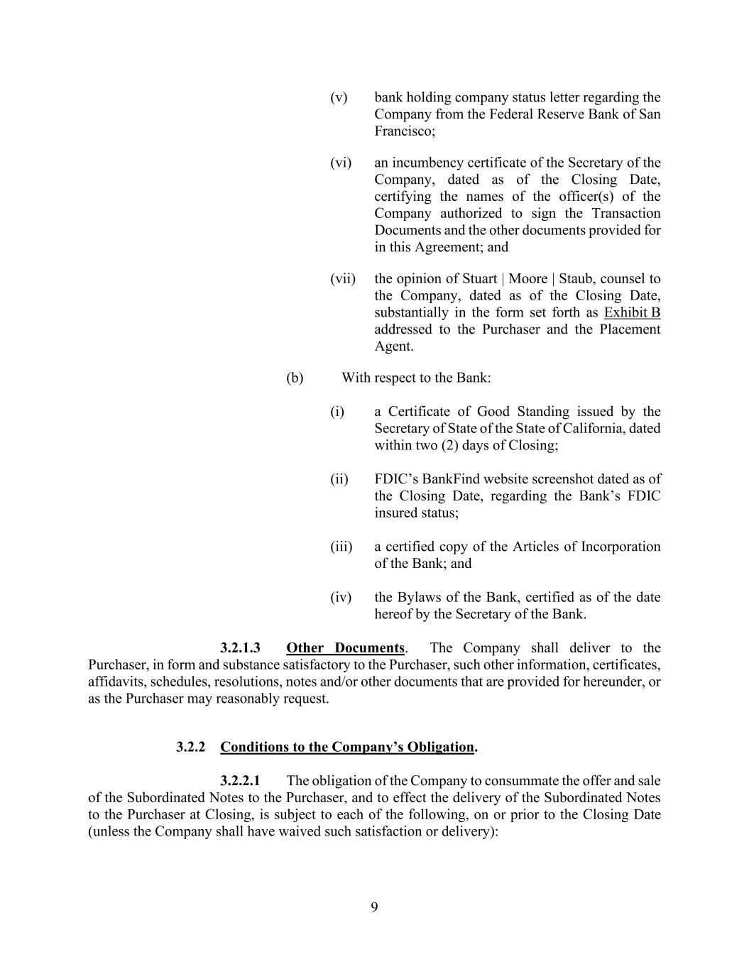 9 (v) bank holding company status letter regarding the Company from the Federal Reserve Bank of San Francisco; (vi) an incumbency certificate of the Secretary of the Company, dated as of the Closing Date, certifying the names of the officer(s) of the Company authorized to sign the Transaction Documents and the other documents provided for in this Agreement; and (vii) the opinion of Stuart | Moore | Staub, counsel to the Company, dated as of the Closing Date, substantially in the form set forth as Exhibit B addressed to the Purchaser and the Placement Agent. (b) With respect to the Bank: (i) a Certificate of Good Standing issued by the Secretary of State of the State of California, dated within two (2) days of Closing; (ii) FDIC’s BankFind website screenshot dated as of the Closing Date, regarding the Bank’s FDIC insured status; (iii) a certified copy of the Articles of Incorporation of the Bank; and (iv) the Bylaws of the Bank, certified as of the date hereof by the Secretary of the Bank. 3.2.1.3 Other Documents. The Company shall deliver to the Purchaser, in form and substance satisfactory to the Purchaser, such other information, certificates, affidavits, schedules, resolutions, notes and/or other documents that are provided for hereunder, or as the Purchaser may reasonably request. 3.2.2 Conditions to the Company’s Obligation. 3.2.2.1 The obligation of the Company to consummate the offer and sale of the Subordinated Notes to the Purchaser, and to effect the delivery of the Subordinated Notes to the Purchaser at Closing, is subject to each of the following, on or prior to the Closing Date (unless the Company shall have waived such satisfaction or delivery):
