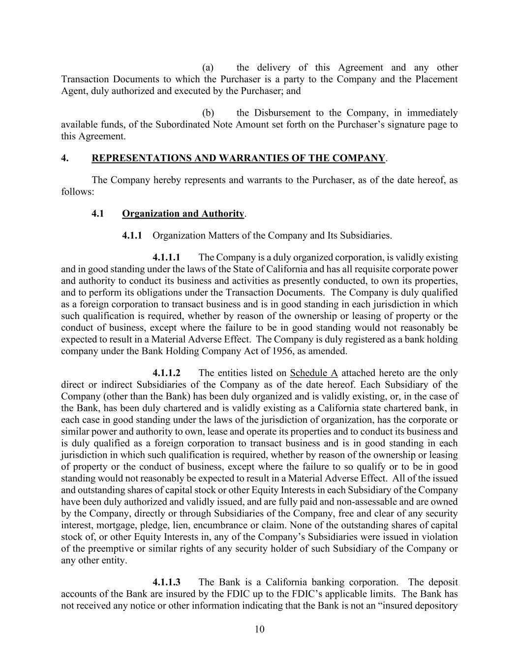 10 (a) the delivery of this Agreement and any other Transaction Documents to which the Purchaser is a party to the Company and the Placement Agent, duly authorized and executed by the Purchaser; and (b) the Disbursement to the Company, in immediately available funds, of the Subordinated Note Amount set forth on the Purchaser’s signature page to this Agreement. 4. REPRESENTATIONS AND WARRANTIES OF THE COMPANY. The Company hereby represents and warrants to the Purchaser, as of the date hereof, as follows: 4.1 Organization and Authority. 4.1.1 Organization Matters of the Company and Its Subsidiaries. 4.1.1.1 The Company is a duly organized corporation, is validly existing and in good standing under the laws of the State of California and has all requisite corporate power and authority to conduct its business and activities as presently conducted, to own its properties, and to perform its obligations under the Transaction Documents. The Company is duly qualified as a foreign corporation to transact business and is in good standing in each jurisdiction in which such qualification is required, whether by reason of the ownership or leasing of property or the conduct of business, except where the failure to be in good standing would not reasonably be expected to result in a Material Adverse Effect. The Company is duly registered as a bank holding company under the Bank Holding Company Act of 1956, as amended. 4.1.1.2 The entities listed on Schedule A attached hereto are the only direct or indirect Subsidiaries of the Company as of the date hereof. Each Subsidiary of the Company (other than the Bank) has been duly organized and is validly existing, or, in the case of the Bank, has been duly chartered and is validly existing as a California state chartered bank, in each case in good standing under the laws of the jurisdiction of organization, has the corporate or similar power and authority to own, lease and operate its properties and to conduct its business and is duly qualified as a foreign corporation to transact business and is in good standing in each jurisdiction in which such qualification is required, whether by reason of the ownership or leasing of property or the conduct of business, except where the failure to so qualify or to be in good standing would not reasonably be expected to result in a Material Adverse Effect. All of the issued and outstanding shares of capital stock or other Equity Interests in each Subsidiary of the Company have been duly authorized and validly issued, and are fully paid and non-assessable and are owned by the Company, directly or through Subsidiaries of the Company, free and clear of any security interest, mortgage, pledge, lien, encumbrance or claim. None of the outstanding shares of capital stock of, or other Equity Interests in, any of the Company’s Subsidiaries were issued in violation of the preemptive or similar rights of any security holder of such Subsidiary of the Company or any other entity. 4.1.1.3 The Bank is a California banking corporation. The deposit accounts of the Bank are insured by the FDIC up to the FDIC’s applicable limits. The Bank has not received any notice or other information indicating that the Bank is not an “insured depository