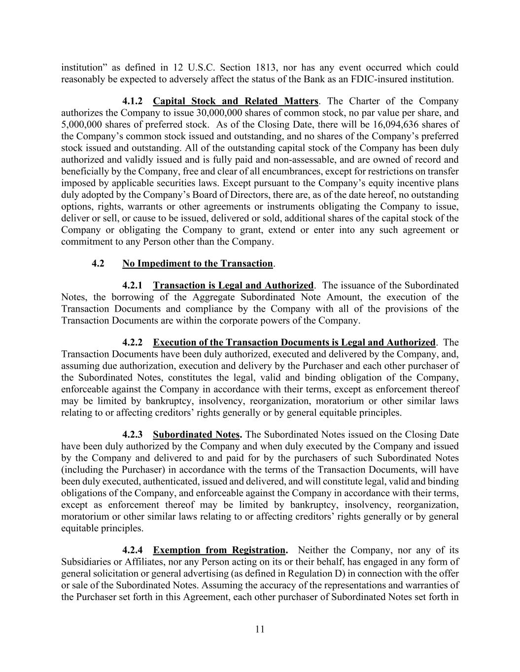 11 institution” as defined in 12 U.S.C. Section 1813, nor has any event occurred which could reasonably be expected to adversely affect the status of the Bank as an FDIC-insured institution. 4.1.2 Capital Stock and Related Matters. The Charter of the Company authorizes the Company to issue 30,000,000 shares of common stock, no par value per share, and 5,000,000 shares of preferred stock. As of the Closing Date, there will be 16,094,636 shares of the Company’s common stock issued and outstanding, and no shares of the Company’s preferred stock issued and outstanding. All of the outstanding capital stock of the Company has been duly authorized and validly issued and is fully paid and non-assessable, and are owned of record and beneficially by the Company, free and clear of all encumbrances, except for restrictions on transfer imposed by applicable securities laws. Except pursuant to the Company’s equity incentive plans duly adopted by the Company’s Board of Directors, there are, as of the date hereof, no outstanding options, rights, warrants or other agreements or instruments obligating the Company to issue, deliver or sell, or cause to be issued, delivered or sold, additional shares of the capital stock of the Company or obligating the Company to grant, extend or enter into any such agreement or commitment to any Person other than the Company. 4.2 No Impediment to the Transaction. 4.2.1 Transaction is Legal and Authorized. The issuance of the Subordinated Notes, the borrowing of the Aggregate Subordinated Note Amount, the execution of the Transaction Documents and compliance by the Company with all of the provisions of the Transaction Documents are within the corporate powers of the Company. 4.2.2 Execution of the Transaction Documents is Legal and Authorized. The Transaction Documents have been duly authorized, executed and delivered by the Company, and, assuming due authorization, execution and delivery by the Purchaser and each other purchaser of the Subordinated Notes, constitutes the legal, valid and binding obligation of the Company, enforceable against the Company in accordance with their terms, except as enforcement thereof may be limited by bankruptcy, insolvency, reorganization, moratorium or other similar laws relating to or affecting creditors’ rights generally or by general equitable principles. 4.2.3 Subordinated Notes. The Subordinated Notes issued on the Closing Date have been duly authorized by the Company and when duly executed by the Company and issued by the Company and delivered to and paid for by the purchasers of such Subordinated Notes (including the Purchaser) in accordance with the terms of the Transaction Documents, will have been duly executed, authenticated, issued and delivered, and will constitute legal, valid and binding obligations of the Company, and enforceable against the Company in accordance with their terms, except as enforcement thereof may be limited by bankruptcy, insolvency, reorganization, moratorium or other similar laws relating to or affecting creditors’ rights generally or by general equitable principles. 4.2.4 Exemption from Registration. Neither the Company, nor any of its Subsidiaries or Affiliates, nor any Person acting on its or their behalf, has engaged in any form of general solicitation or general advertising (as defined in Regulation D) in connection with the offer or sale of the Subordinated Notes. Assuming the accuracy of the representations and warranties of the Purchaser set forth in this Agreement, each other purchaser of Subordinated Notes set forth in