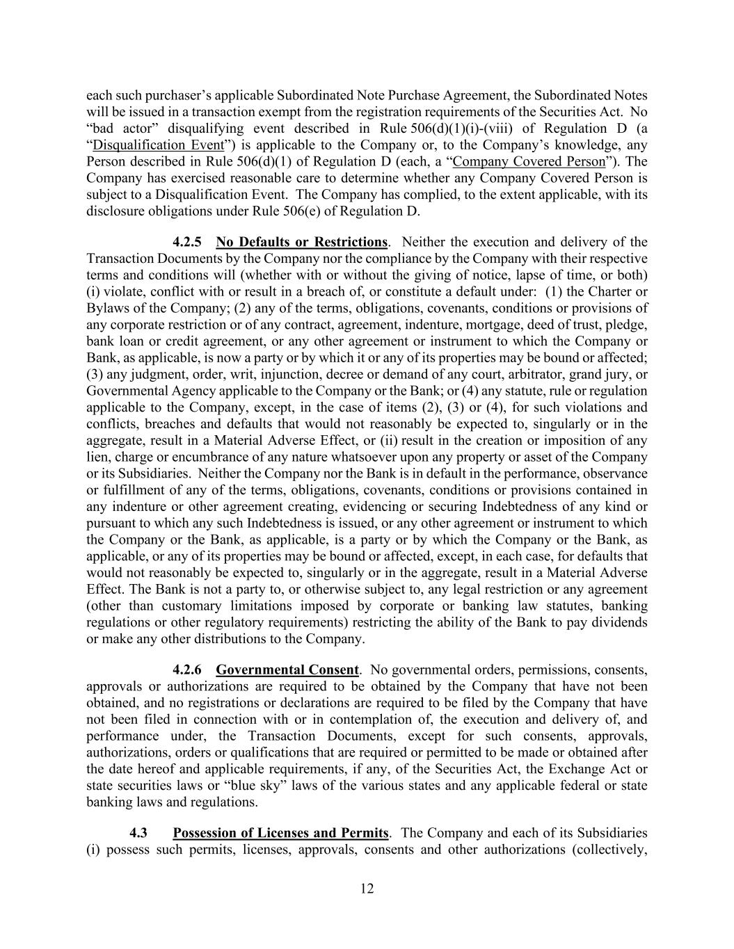 12 each such purchaser’s applicable Subordinated Note Purchase Agreement, the Subordinated Notes will be issued in a transaction exempt from the registration requirements of the Securities Act. No “bad actor” disqualifying event described in Rule 506(d)(1)(i)-(viii) of Regulation D (a “Disqualification Event”) is applicable to the Company or, to the Company’s knowledge, any Person described in Rule 506(d)(1) of Regulation D (each, a “Company Covered Person”). The Company has exercised reasonable care to determine whether any Company Covered Person is subject to a Disqualification Event. The Company has complied, to the extent applicable, with its disclosure obligations under Rule 506(e) of Regulation D. 4.2.5 No Defaults or Restrictions. Neither the execution and delivery of the Transaction Documents by the Company nor the compliance by the Company with their respective terms and conditions will (whether with or without the giving of notice, lapse of time, or both) (i) violate, conflict with or result in a breach of, or constitute a default under: (1) the Charter or Bylaws of the Company; (2) any of the terms, obligations, covenants, conditions or provisions of any corporate restriction or of any contract, agreement, indenture, mortgage, deed of trust, pledge, bank loan or credit agreement, or any other agreement or instrument to which the Company or Bank, as applicable, is now a party or by which it or any of its properties may be bound or affected; (3) any judgment, order, writ, injunction, decree or demand of any court, arbitrator, grand jury, or Governmental Agency applicable to the Company or the Bank; or (4) any statute, rule or regulation applicable to the Company, except, in the case of items (2), (3) or (4), for such violations and conflicts, breaches and defaults that would not reasonably be expected to, singularly or in the aggregate, result in a Material Adverse Effect, or (ii) result in the creation or imposition of any lien, charge or encumbrance of any nature whatsoever upon any property or asset of the Company or its Subsidiaries. Neither the Company nor the Bank is in default in the performance, observance or fulfillment of any of the terms, obligations, covenants, conditions or provisions contained in any indenture or other agreement creating, evidencing or securing Indebtedness of any kind or pursuant to which any such Indebtedness is issued, or any other agreement or instrument to which the Company or the Bank, as applicable, is a party or by which the Company or the Bank, as applicable, or any of its properties may be bound or affected, except, in each case, for defaults that would not reasonably be expected to, singularly or in the aggregate, result in a Material Adverse Effect. The Bank is not a party to, or otherwise subject to, any legal restriction or any agreement (other than customary limitations imposed by corporate or banking law statutes, banking regulations or other regulatory requirements) restricting the ability of the Bank to pay dividends or make any other distributions to the Company. 4.2.6 Governmental Consent. No governmental orders, permissions, consents, approvals or authorizations are required to be obtained by the Company that have not been obtained, and no registrations or declarations are required to be filed by the Company that have not been filed in connection with or in contemplation of, the execution and delivery of, and performance under, the Transaction Documents, except for such consents, approvals, authorizations, orders or qualifications that are required or permitted to be made or obtained after the date hereof and applicable requirements, if any, of the Securities Act, the Exchange Act or state securities laws or “blue sky” laws of the various states and any applicable federal or state banking laws and regulations. 4.3 Possession of Licenses and Permits. The Company and each of its Subsidiaries (i) possess such permits, licenses, approvals, consents and other authorizations (collectively,