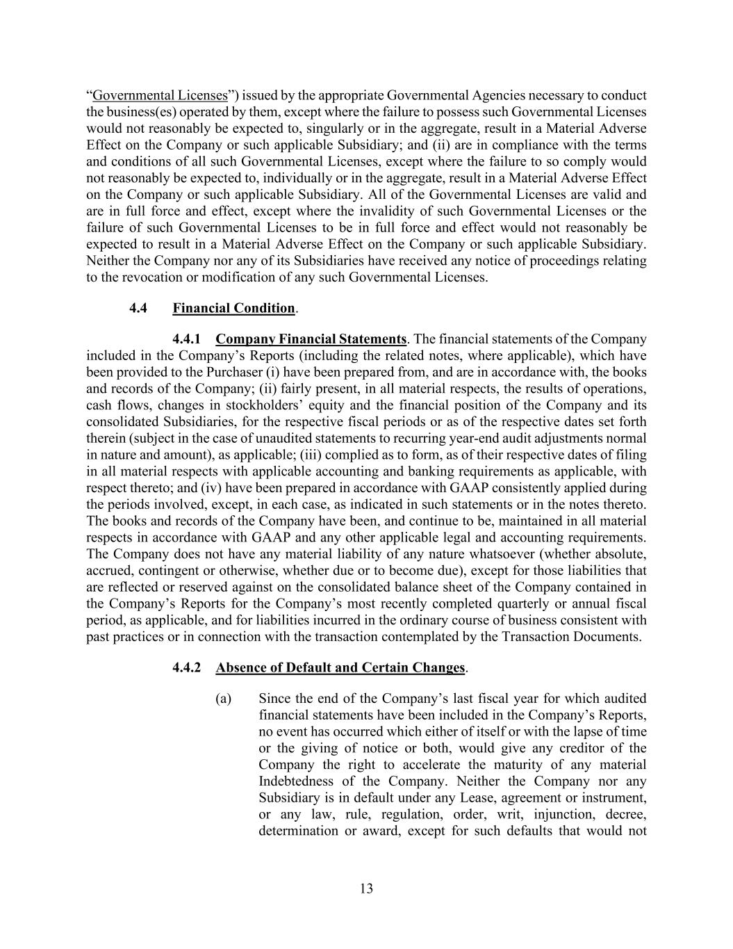 13 “Governmental Licenses”) issued by the appropriate Governmental Agencies necessary to conduct the business(es) operated by them, except where the failure to possess such Governmental Licenses would not reasonably be expected to, singularly or in the aggregate, result in a Material Adverse Effect on the Company or such applicable Subsidiary; and (ii) are in compliance with the terms and conditions of all such Governmental Licenses, except where the failure to so comply would not reasonably be expected to, individually or in the aggregate, result in a Material Adverse Effect on the Company or such applicable Subsidiary. All of the Governmental Licenses are valid and are in full force and effect, except where the invalidity of such Governmental Licenses or the failure of such Governmental Licenses to be in full force and effect would not reasonably be expected to result in a Material Adverse Effect on the Company or such applicable Subsidiary. Neither the Company nor any of its Subsidiaries have received any notice of proceedings relating to the revocation or modification of any such Governmental Licenses. 4.4 Financial Condition. 4.4.1 Company Financial Statements. The financial statements of the Company included in the Company’s Reports (including the related notes, where applicable), which have been provided to the Purchaser (i) have been prepared from, and are in accordance with, the books and records of the Company; (ii) fairly present, in all material respects, the results of operations, cash flows, changes in stockholders’ equity and the financial position of the Company and its consolidated Subsidiaries, for the respective fiscal periods or as of the respective dates set forth therein (subject in the case of unaudited statements to recurring year-end audit adjustments normal in nature and amount), as applicable; (iii) complied as to form, as of their respective dates of filing in all material respects with applicable accounting and banking requirements as applicable, with respect thereto; and (iv) have been prepared in accordance with GAAP consistently applied during the periods involved, except, in each case, as indicated in such statements or in the notes thereto. The books and records of the Company have been, and continue to be, maintained in all material respects in accordance with GAAP and any other applicable legal and accounting requirements. The Company does not have any material liability of any nature whatsoever (whether absolute, accrued, contingent or otherwise, whether due or to become due), except for those liabilities that are reflected or reserved against on the consolidated balance sheet of the Company contained in the Company’s Reports for the Company’s most recently completed quarterly or annual fiscal period, as applicable, and for liabilities incurred in the ordinary course of business consistent with past practices or in connection with the transaction contemplated by the Transaction Documents. 4.4.2 Absence of Default and Certain Changes. (a) Since the end of the Company’s last fiscal year for which audited financial statements have been included in the Company’s Reports, no event has occurred which either of itself or with the lapse of time or the giving of notice or both, would give any creditor of the Company the right to accelerate the maturity of any material Indebtedness of the Company. Neither the Company nor any Subsidiary is in default under any Lease, agreement or instrument, or any law, rule, regulation, order, writ, injunction, decree, determination or award, except for such defaults that would not