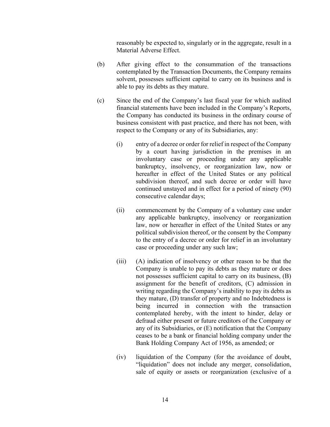 14 reasonably be expected to, singularly or in the aggregate, result in a Material Adverse Effect. (b) After giving effect to the consummation of the transactions contemplated by the Transaction Documents, the Company remains solvent, possesses sufficient capital to carry on its business and is able to pay its debts as they mature. (c) Since the end of the Company’s last fiscal year for which audited financial statements have been included in the Company’s Reports, the Company has conducted its business in the ordinary course of business consistent with past practice, and there has not been, with respect to the Company or any of its Subsidiaries, any: (i) entry of a decree or order for relief in respect of the Company by a court having jurisdiction in the premises in an involuntary case or proceeding under any applicable bankruptcy, insolvency, or reorganization law, now or hereafter in effect of the United States or any political subdivision thereof, and such decree or order will have continued unstayed and in effect for a period of ninety (90) consecutive calendar days; (ii) commencement by the Company of a voluntary case under any applicable bankruptcy, insolvency or reorganization law, now or hereafter in effect of the United States or any political subdivision thereof, or the consent by the Company to the entry of a decree or order for relief in an involuntary case or proceeding under any such law; (iii) (A) indication of insolvency or other reason to be that the Company is unable to pay its debts as they mature or does not possesses sufficient capital to carry on its business, (B) assignment for the benefit of creditors, (C) admission in writing regarding the Company’s inability to pay its debts as they mature, (D) transfer of property and no Indebtedness is being incurred in connection with the transaction contemplated hereby, with the intent to hinder, delay or defraud either present or future creditors of the Company or any of its Subsidiaries, or (E) notification that the Company ceases to be a bank or financial holding company under the Bank Holding Company Act of 1956, as amended; or (iv) liquidation of the Company (for the avoidance of doubt, “liquidation” does not include any merger, consolidation, sale of equity or assets or reorganization (exclusive of a