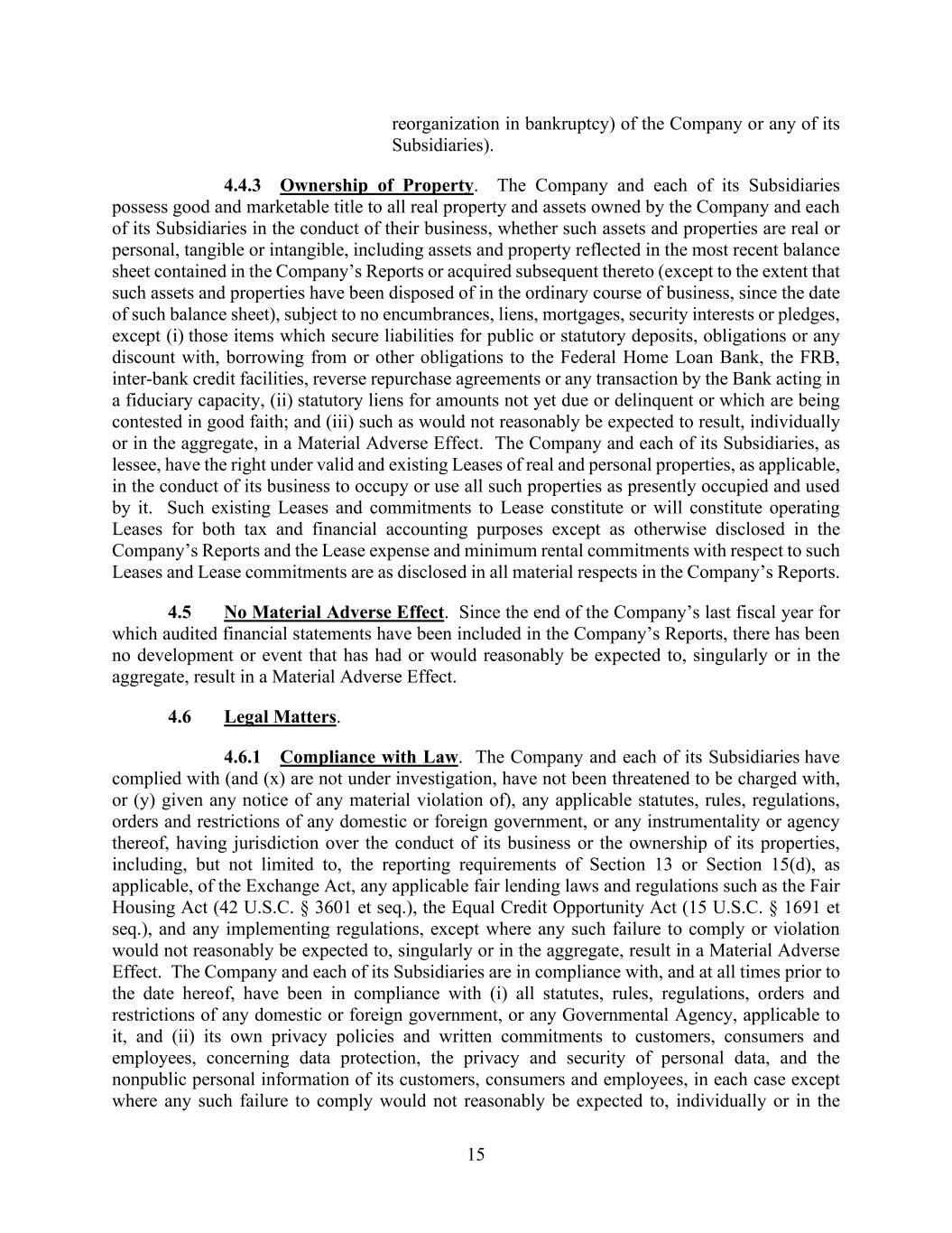 15 reorganization in bankruptcy) of the Company or any of its Subsidiaries). 4.4.3 Ownership of Property. The Company and each of its Subsidiaries possess good and marketable title to all real property and assets owned by the Company and each of its Subsidiaries in the conduct of their business, whether such assets and properties are real or personal, tangible or intangible, including assets and property reflected in the most recent balance sheet contained in the Company’s Reports or acquired subsequent thereto (except to the extent that such assets and properties have been disposed of in the ordinary course of business, since the date of such balance sheet), subject to no encumbrances, liens, mortgages, security interests or pledges, except (i) those items which secure liabilities for public or statutory deposits, obligations or any discount with, borrowing from or other obligations to the Federal Home Loan Bank, the FRB, inter-bank credit facilities, reverse repurchase agreements or any transaction by the Bank acting in a fiduciary capacity, (ii) statutory liens for amounts not yet due or delinquent or which are being contested in good faith; and (iii) such as would not reasonably be expected to result, individually or in the aggregate, in a Material Adverse Effect. The Company and each of its Subsidiaries, as lessee, have the right under valid and existing Leases of real and personal properties, as applicable, in the conduct of its business to occupy or use all such properties as presently occupied and used by it. Such existing Leases and commitments to Lease constitute or will constitute operating Leases for both tax and financial accounting purposes except as otherwise disclosed in the Company’s Reports and the Lease expense and minimum rental commitments with respect to such Leases and Lease commitments are as disclosed in all material respects in the Company’s Reports. 4.5 No Material Adverse Effect. Since the end of the Company’s last fiscal year for which audited financial statements have been included in the Company’s Reports, there has been no development or event that has had or would reasonably be expected to, singularly or in the aggregate, result in a Material Adverse Effect. 4.6 Legal Matters. 4.6.1 Compliance with Law. The Company and each of its Subsidiaries have complied with (and (x) are not under investigation, have not been threatened to be charged with, or (y) given any notice of any material violation of), any applicable statutes, rules, regulations, orders and restrictions of any domestic or foreign government, or any instrumentality or agency thereof, having jurisdiction over the conduct of its business or the ownership of its properties, including, but not limited to, the reporting requirements of Section 13 or Section 15(d), as applicable, of the Exchange Act, any applicable fair lending laws and regulations such as the Fair Housing Act (42 U.S.C. § 3601 et seq.), the Equal Credit Opportunity Act (15 U.S.C. § 1691 et seq.), and any implementing regulations, except where any such failure to comply or violation would not reasonably be expected to, singularly or in the aggregate, result in a Material Adverse Effect. The Company and each of its Subsidiaries are in compliance with, and at all times prior to the date hereof, have been in compliance with (i) all statutes, rules, regulations, orders and restrictions of any domestic or foreign government, or any Governmental Agency, applicable to it, and (ii) its own privacy policies and written commitments to customers, consumers and employees, concerning data protection, the privacy and security of personal data, and the nonpublic personal information of its customers, consumers and employees, in each case except where any such failure to comply would not reasonably be expected to, individually or in the