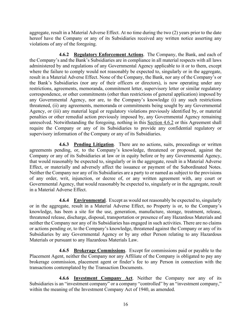 16 aggregate, result in a Material Adverse Effect. At no time during the two (2) years prior to the date hereof have the Company or any of its Subsidiaries received any written notice asserting any violations of any of the foregoing. 4.6.2 Regulatory Enforcement Actions. The Company, the Bank, and each of the Company’s and the Bank’s Subsidiaries are in compliance in all material respects with all laws administered by and regulations of any Governmental Agency applicable to it or to them, except where the failure to comply would not reasonably be expected to, singularly or in the aggregate, result in a Material Adverse Effect. None of the Company, the Bank, nor any of the Company’s or the Bank’s Subsidiaries (nor any of their officers or directors), is now operating under any restrictions, agreements, memoranda, commitment letter, supervisory letter or similar regulatory correspondence, or other commitments (other than restrictions of general application) imposed by any Governmental Agency, nor are, to the Company’s knowledge (i) any such restrictions threatened, (ii) any agreements, memoranda or commitments being sought by any Governmental Agency, or (iii) any material legal or regulatory violations previously identified by, or material penalties or other remedial action previously imposed by, any Governmental Agency remaining unresolved. Notwithstanding the foregoing, nothing in this Section 4.6.2 or this Agreement shall require the Company or any of its Subsidiaries to provide any confidential regulatory or supervisory information of the Company or any of its Subsidiaries. 4.6.3 Pending Litigation. There are no actions, suits, proceedings or written agreements pending, or, to the Company’s knowledge, threatened or proposed, against the Company or any of its Subsidiaries at law or in equity before or by any Governmental Agency, that would reasonably be expected to, singularly or in the aggregate, result in a Material Adverse Effect, or materially and adversely affect the issuance or payment of the Subordinated Notes. Neither the Company nor any of its Subsidiaries are a party to or named as subject to the provisions of any order, writ, injunction, or decree of, or any written agreement with, any court or Governmental Agency, that would reasonably be expected to, singularly or in the aggregate, result in a Material Adverse Effect. 4.6.4 Environmental. Except as would not reasonably be expected to, singularly or in the aggregate, result in a Material Adverse Effect, no Property is or, to the Company’s knowledge, has been a site for the use, generation, manufacture, storage, treatment, release, threatened release, discharge, disposal, transportation or presence of any Hazardous Materials and neither the Company nor any of its Subsidiaries has engaged in such activities. There are no claims or actions pending or, to the Company’s knowledge, threatened against the Company or any of its Subsidiaries by any Governmental Agency or by any other Person relating to any Hazardous Materials or pursuant to any Hazardous Materials Law. 4.6.5 Brokerage Commissions. Except for commissions paid or payable to the Placement Agent, neither the Company nor any Affiliate of the Company is obligated to pay any brokerage commission, placement agent or finder’s fee to any Person in connection with the transactions contemplated by the Transaction Documents. 4.6.6 Investment Company Act. Neither the Company nor any of its Subsidiaries is an “investment company” or a company “controlled” by an “investment company,” within the meaning of the Investment Company Act of 1940, as amended.