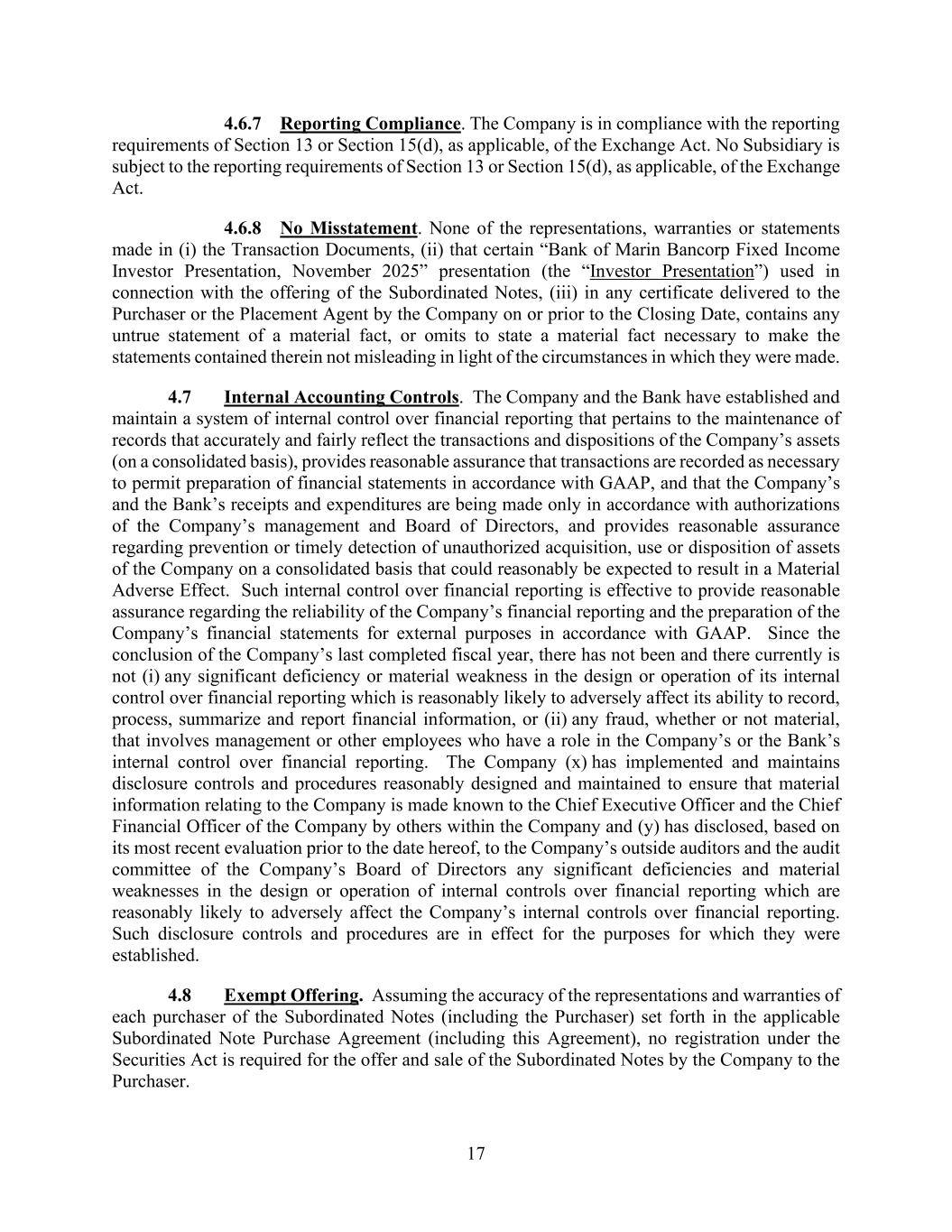 17 4.6.7 Reporting Compliance. The Company is in compliance with the reporting requirements of Section 13 or Section 15(d), as applicable, of the Exchange Act. No Subsidiary is subject to the reporting requirements of Section 13 or Section 15(d), as applicable, of the Exchange Act. 4.6.8 No Misstatement. None of the representations, warranties or statements made in (i) the Transaction Documents, (ii) that certain “Bank of Marin Bancorp Fixed Income Investor Presentation, November 2025” presentation (the “Investor Presentation”) used in connection with the offering of the Subordinated Notes, (iii) in any certificate delivered to the Purchaser or the Placement Agent by the Company on or prior to the Closing Date, contains any untrue statement of a material fact, or omits to state a material fact necessary to make the statements contained therein not misleading in light of the circumstances in which they were made. 4.7 Internal Accounting Controls. The Company and the Bank have established and maintain a system of internal control over financial reporting that pertains to the maintenance of records that accurately and fairly reflect the transactions and dispositions of the Company’s assets (on a consolidated basis), provides reasonable assurance that transactions are recorded as necessary to permit preparation of financial statements in accordance with GAAP, and that the Company’s and the Bank’s receipts and expenditures are being made only in accordance with authorizations of the Company’s management and Board of Directors, and provides reasonable assurance regarding prevention or timely detection of unauthorized acquisition, use or disposition of assets of the Company on a consolidated basis that could reasonably be expected to result in a Material Adverse Effect. Such internal control over financial reporting is effective to provide reasonable assurance regarding the reliability of the Company’s financial reporting and the preparation of the Company’s financial statements for external purposes in accordance with GAAP. Since the conclusion of the Company’s last completed fiscal year, there has not been and there currently is not (i) any significant deficiency or material weakness in the design or operation of its internal control over financial reporting which is reasonably likely to adversely affect its ability to record, process, summarize and report financial information, or (ii) any fraud, whether or not material, that involves management or other employees who have a role in the Company’s or the Bank’s internal control over financial reporting. The Company (x) has implemented and maintains disclosure controls and procedures reasonably designed and maintained to ensure that material information relating to the Company is made known to the Chief Executive Officer and the Chief Financial Officer of the Company by others within the Company and (y) has disclosed, based on its most recent evaluation prior to the date hereof, to the Company’s outside auditors and the audit committee of the Company’s Board of Directors any significant deficiencies and material weaknesses in the design or operation of internal controls over financial reporting which are reasonably likely to adversely affect the Company’s internal controls over financial reporting. Such disclosure controls and procedures are in effect for the purposes for which they were established. 4.8 Exempt Offering. Assuming the accuracy of the representations and warranties of each purchaser of the Subordinated Notes (including the Purchaser) set forth in the applicable Subordinated Note Purchase Agreement (including this Agreement), no registration under the Securities Act is required for the offer and sale of the Subordinated Notes by the Company to the Purchaser.