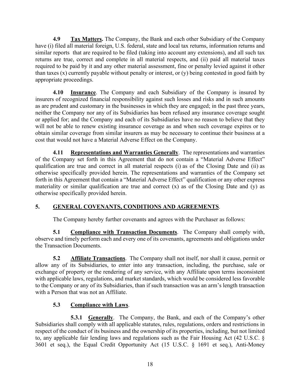 18 4.9 Tax Matters. The Company, the Bank and each other Subsidiary of the Company have (i) filed all material foreign, U.S. federal, state and local tax returns, information returns and similar reports that are required to be filed (taking into account any extensions), and all such tax returns are true, correct and complete in all material respects, and (ii) paid all material taxes required to be paid by it and any other material assessment, fine or penalty levied against it other than taxes (x) currently payable without penalty or interest, or (y) being contested in good faith by appropriate proceedings. 4.10 Insurance. The Company and each Subsidiary of the Company is insured by insurers of recognized financial responsibility against such losses and risks and in such amounts as are prudent and customary in the businesses in which they are engaged; in the past three years, neither the Company nor any of its Subsidiaries has been refused any insurance coverage sought or applied for; and the Company and each of its Subsidiaries have no reason to believe that they will not be able to renew existing insurance coverage as and when such coverage expires or to obtain similar coverage from similar insurers as may be necessary to continue their business at a cost that would not have a Material Adverse Effect on the Company. 4.11 Representations and Warranties Generally. The representations and warranties of the Company set forth in this Agreement that do not contain a “Material Adverse Effect” qualification are true and correct in all material respects (i) as of the Closing Date and (ii) as otherwise specifically provided herein. The representations and warranties of the Company set forth in this Agreement that contain a “Material Adverse Effect” qualification or any other express materiality or similar qualification are true and correct (x) as of the Closing Date and (y) as otherwise specifically provided herein. 5. GENERAL COVENANTS, CONDITIONS AND AGREEMENTS. The Company hereby further covenants and agrees with the Purchaser as follows: 5.1 Compliance with Transaction Documents. The Company shall comply with, observe and timely perform each and every one of its covenants, agreements and obligations under the Transaction Documents. 5.2 Affiliate Transactions. The Company shall not itself, nor shall it cause, permit or allow any of its Subsidiaries, to enter into any transaction, including, the purchase, sale or exchange of property or the rendering of any service, with any Affiliate upon terms inconsistent with applicable laws, regulations, and market standards, which would be considered less favorable to the Company or any of its Subsidiaries, than if such transaction was an arm’s length transaction with a Person that was not an Affiliate. 5.3 Compliance with Laws. 5.3.1 Generally. The Company, the Bank, and each of the Company’s other Subsidiaries shall comply with all applicable statutes, rules, regulations, orders and restrictions in respect of the conduct of its business and the ownership of its properties, including, but not limited to, any applicable fair lending laws and regulations such as the Fair Housing Act (42 U.S.C. § 3601 et seq.), the Equal Credit Opportunity Act (15 U.S.C. § 1691 et seq.), Anti-Money