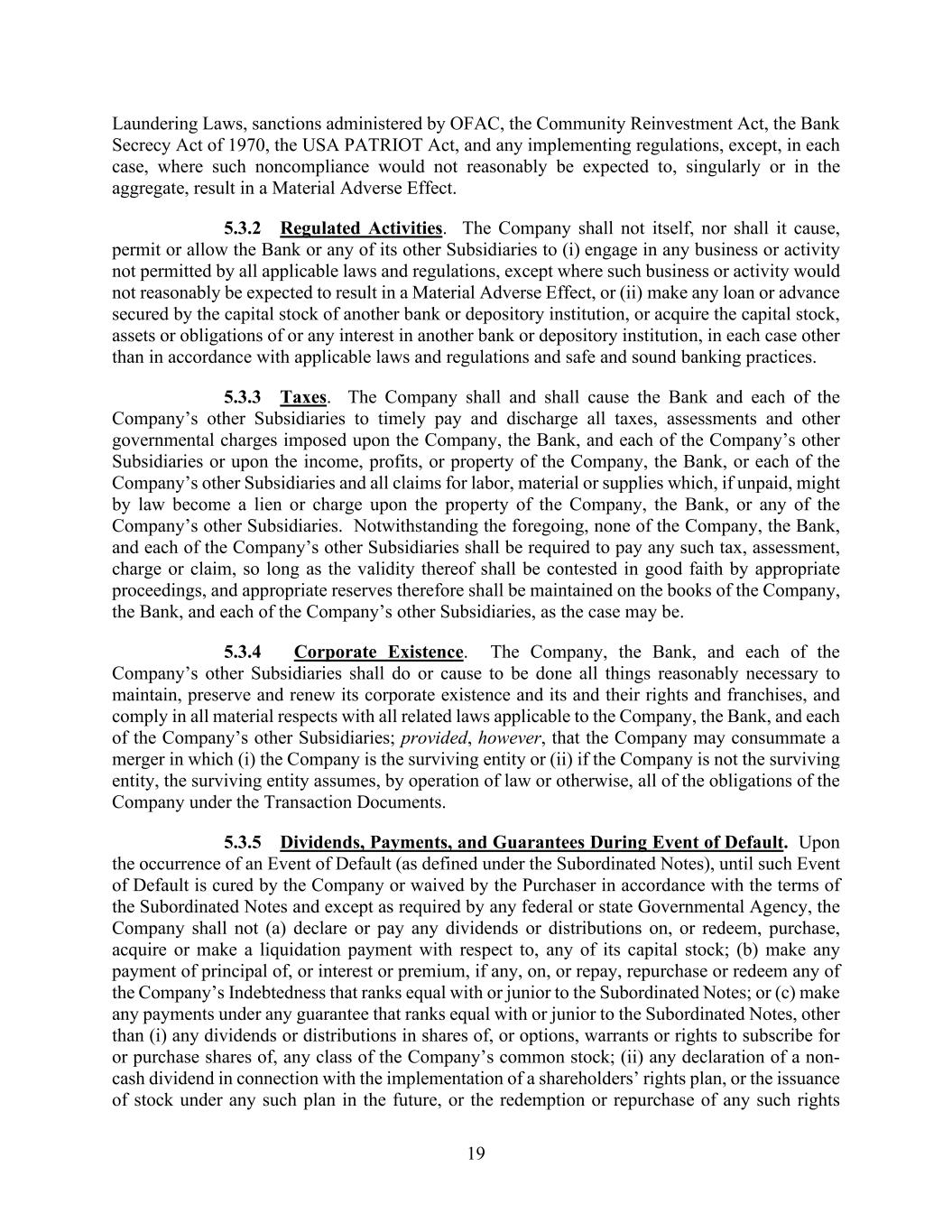 19 Laundering Laws, sanctions administered by OFAC, the Community Reinvestment Act, the Bank Secrecy Act of 1970, the USA PATRIOT Act, and any implementing regulations, except, in each case, where such noncompliance would not reasonably be expected to, singularly or in the aggregate, result in a Material Adverse Effect. 5.3.2 Regulated Activities. The Company shall not itself, nor shall it cause, permit or allow the Bank or any of its other Subsidiaries to (i) engage in any business or activity not permitted by all applicable laws and regulations, except where such business or activity would not reasonably be expected to result in a Material Adverse Effect, or (ii) make any loan or advance secured by the capital stock of another bank or depository institution, or acquire the capital stock, assets or obligations of or any interest in another bank or depository institution, in each case other than in accordance with applicable laws and regulations and safe and sound banking practices. 5.3.3 Taxes. The Company shall and shall cause the Bank and each of the Company’s other Subsidiaries to timely pay and discharge all taxes, assessments and other governmental charges imposed upon the Company, the Bank, and each of the Company’s other Subsidiaries or upon the income, profits, or property of the Company, the Bank, or each of the Company’s other Subsidiaries and all claims for labor, material or supplies which, if unpaid, might by law become a lien or charge upon the property of the Company, the Bank, or any of the Company’s other Subsidiaries. Notwithstanding the foregoing, none of the Company, the Bank, and each of the Company’s other Subsidiaries shall be required to pay any such tax, assessment, charge or claim, so long as the validity thereof shall be contested in good faith by appropriate proceedings, and appropriate reserves therefore shall be maintained on the books of the Company, the Bank, and each of the Company’s other Subsidiaries, as the case may be. 5.3.4 Corporate Existence. The Company, the Bank, and each of the Company’s other Subsidiaries shall do or cause to be done all things reasonably necessary to maintain, preserve and renew its corporate existence and its and their rights and franchises, and comply in all material respects with all related laws applicable to the Company, the Bank, and each of the Company’s other Subsidiaries; provided, however, that the Company may consummate a merger in which (i) the Company is the surviving entity or (ii) if the Company is not the surviving entity, the surviving entity assumes, by operation of law or otherwise, all of the obligations of the Company under the Transaction Documents. 5.3.5 Dividends, Payments, and Guarantees During Event of Default. Upon the occurrence of an Event of Default (as defined under the Subordinated Notes), until such Event of Default is cured by the Company or waived by the Purchaser in accordance with the terms of the Subordinated Notes and except as required by any federal or state Governmental Agency, the Company shall not (a) declare or pay any dividends or distributions on, or redeem, purchase, acquire or make a liquidation payment with respect to, any of its capital stock; (b) make any payment of principal of, or interest or premium, if any, on, or repay, repurchase or redeem any of the Company’s Indebtedness that ranks equal with or junior to the Subordinated Notes; or (c) make any payments under any guarantee that ranks equal with or junior to the Subordinated Notes, other than (i) any dividends or distributions in shares of, or options, warrants or rights to subscribe for or purchase shares of, any class of the Company’s common stock; (ii) any declaration of a non- cash dividend in connection with the implementation of a shareholders’ rights plan, or the issuance of stock under any such plan in the future, or the redemption or repurchase of any such rights