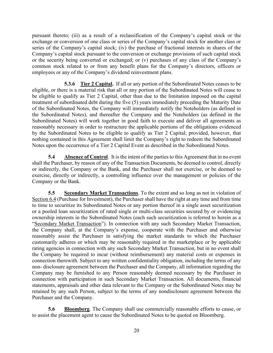 20 pursuant thereto; (iii) as a result of a reclassification of the Company’s capital stock or the exchange or conversion of one class or series of the Company’s capital stock for another class or series of the Company’s capital stock; (iv) the purchase of fractional interests in shares of the Company’s capital stock pursuant to the conversion or exchange provisions of such capital stock or the security being converted or exchanged; or (v) purchases of any class of the Company’s common stock related to or from any benefit plans for the Company’s directors, officers or employees or any of the Company’s dividend reinvestment plans. 5.3.6 Tier 2 Capital. If all or any portion of the Subordinated Notes ceases to be eligible, or there is a material risk that all or any portion of the Subordinated Notes will cease to be eligible to qualify as Tier 2 Capital, other than due to the limitation imposed on the capital treatment of subordinated debt during the five (5) years immediately preceding the Maturity Date of the Subordinated Notes, the Company will immediately notify the Noteholders (as defined in the Subordinated Notes), and thereafter the Company and the Noteholders (as defined in the Subordinated Notes) will work together in good faith to execute and deliver all agreements as reasonably necessary in order to restructure the applicable portions of the obligations evidenced by the Subordinated Notes to be eligible to qualify as Tier 2 Capital; provided, however, that nothing contained in this Agreement shall limit the Company’s right to redeem the Subordinated Notes upon the occurrence of a Tier 2 Capital Event as described in the Subordinated Notes. 5.4 Absence of Control. It is the intent of the parties to this Agreement that in no event shall the Purchaser, by reason of any of the Transaction Documents, be deemed to control, directly or indirectly, the Company or the Bank, and the Purchaser shall not exercise, or be deemed to exercise, directly or indirectly, a controlling influence over the management or policies of the Company or the Bank. 5.5 Secondary Market Transactions. To the extent and so long as not in violation of Section 6.4 (Purchase for Investment), the Purchaser shall have the right at any time and from time to time to securitize its Subordinated Notes or any portion thereof in a single asset securitization or a pooled loan securitization of rated single or multi-class securities secured by or evidencing ownership interests in the Subordinated Notes (each such securitization is referred to herein as a “Secondary Market Transaction”). In connection with any such Secondary Market Transaction, the Company shall, at the Company’s expense, cooperate with the Purchaser and otherwise reasonably assist the Purchaser in satisfying the market standards to which the Purchaser customarily adheres or which may be reasonably required in the marketplace or by applicable rating agencies in connection with any such Secondary Market Transaction, but in no event shall the Company be required to incur (without reimbursement) any material costs or expenses in connection therewith. Subject to any written confidentiality obligation, including the terms of any non- disclosure agreement between the Purchaser and the Company, all information regarding the Company may be furnished to any Person reasonably deemed necessary by the Purchaser in connection with participation in such Secondary Market Transaction. All documents, financial statements, appraisals and other data relevant to the Company or the Subordinated Notes may be retained by any such Person, subject to the terms of any nondisclosure agreement between the Purchaser and the Company. 5.6 Bloomberg. The Company shall use commercially reasonable efforts to cause, or to assist the placement agent to cause the Subordinated Notes to be quoted on Bloomberg.