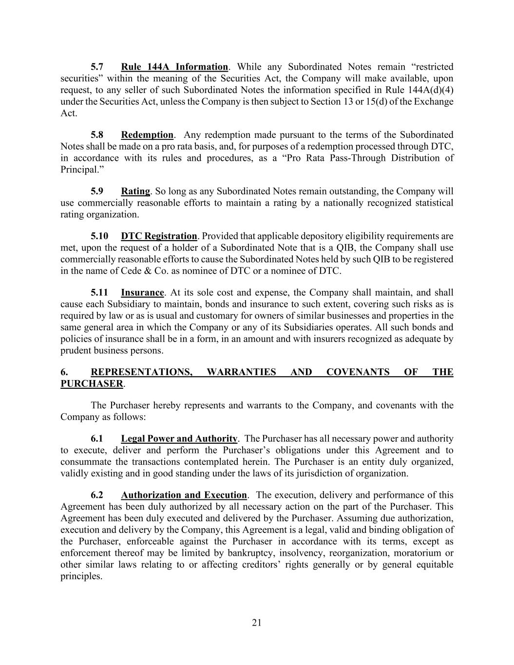 21 5.7 Rule 144A Information. While any Subordinated Notes remain “restricted securities” within the meaning of the Securities Act, the Company will make available, upon request, to any seller of such Subordinated Notes the information specified in Rule 144A(d)(4) under the Securities Act, unless the Company is then subject to Section 13 or 15(d) of the Exchange Act. 5.8 Redemption. Any redemption made pursuant to the terms of the Subordinated Notes shall be made on a pro rata basis, and, for purposes of a redemption processed through DTC, in accordance with its rules and procedures, as a “Pro Rata Pass-Through Distribution of Principal.” 5.9 Rating. So long as any Subordinated Notes remain outstanding, the Company will use commercially reasonable efforts to maintain a rating by a nationally recognized statistical rating organization. 5.10 DTC Registration. Provided that applicable depository eligibility requirements are met, upon the request of a holder of a Subordinated Note that is a QIB, the Company shall use commercially reasonable efforts to cause the Subordinated Notes held by such QIB to be registered in the name of Cede & Co. as nominee of DTC or a nominee of DTC. 5.11 Insurance. At its sole cost and expense, the Company shall maintain, and shall cause each Subsidiary to maintain, bonds and insurance to such extent, covering such risks as is required by law or as is usual and customary for owners of similar businesses and properties in the same general area in which the Company or any of its Subsidiaries operates. All such bonds and policies of insurance shall be in a form, in an amount and with insurers recognized as adequate by prudent business persons. 6. REPRESENTATIONS, WARRANTIES AND COVENANTS OF THE PURCHASER. The Purchaser hereby represents and warrants to the Company, and covenants with the Company as follows: 6.1 Legal Power and Authority. The Purchaser has all necessary power and authority to execute, deliver and perform the Purchaser’s obligations under this Agreement and to consummate the transactions contemplated herein. The Purchaser is an entity duly organized, validly existing and in good standing under the laws of its jurisdiction of organization. 6.2 Authorization and Execution. The execution, delivery and performance of this Agreement has been duly authorized by all necessary action on the part of the Purchaser. This Agreement has been duly executed and delivered by the Purchaser. Assuming due authorization, execution and delivery by the Company, this Agreement is a legal, valid and binding obligation of the Purchaser, enforceable against the Purchaser in accordance with its terms, except as enforcement thereof may be limited by bankruptcy, insolvency, reorganization, moratorium or other similar laws relating to or affecting creditors’ rights generally or by general equitable principles.