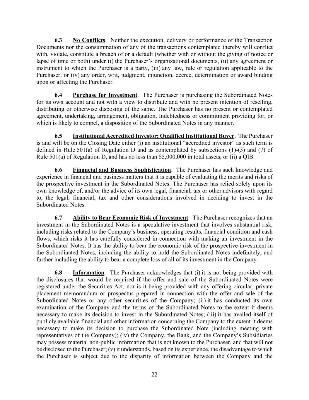22 6.3 No Conflicts. Neither the execution, delivery or performance of the Transaction Documents nor the consummation of any of the transactions contemplated thereby will conflict with, violate, constitute a breach of or a default (whether with or without the giving of notice or lapse of time or both) under (i) the Purchaser’s organizational documents, (ii) any agreement or instrument to which the Purchaser is a party, (iii) any law, rule or regulation applicable to the Purchaser; or (iv) any order, writ, judgment, injunction, decree, determination or award binding upon or affecting the Purchaser. 6.4 Purchase for Investment. The Purchaser is purchasing the Subordinated Notes for its own account and not with a view to distribute and with no present intention of reselling, distributing or otherwise disposing of the same. The Purchaser has no present or contemplated agreement, undertaking, arrangement, obligation, Indebtedness or commitment providing for, or which is likely to compel, a disposition of the Subordinated Notes in any manner. 6.5 Institutional Accredited Investor; Qualified Institutional Buyer. The Purchaser is and will be on the Closing Date either (i) an institutional “accredited investor” as such term is defined in Rule 501(a) of Regulation D and as contemplated by subsections (1)-(3) and (7) of Rule 501(a) of Regulation D, and has no less than $5,000,000 in total assets, or (ii) a QIB. 6.6 Financial and Business Sophistication. The Purchaser has such knowledge and experience in financial and business matters that it is capable of evaluating the merits and risks of the prospective investment in the Subordinated Notes. The Purchaser has relied solely upon its own knowledge of, and/or the advice of its own legal, financial, tax or other advisors with regard to, the legal, financial, tax and other considerations involved in deciding to invest in the Subordinated Notes. 6.7 Ability to Bear Economic Risk of Investment. The Purchaser recognizes that an investment in the Subordinated Notes is a speculative investment that involves substantial risk, including risks related to the Company’s business, operating results, financial condition and cash flows, which risks it has carefully considered in connection with making an investment in the Subordinated Notes. It has the ability to bear the economic risk of the prospective investment in the Subordinated Notes, including the ability to hold the Subordinated Notes indefinitely, and further including the ability to bear a complete loss of all of its investment in the Company. 6.8 Information. The Purchaser acknowledges that (i) it is not being provided with the disclosures that would be required if the offer and sale of the Subordinated Notes were registered under the Securities Act, nor is it being provided with any offering circular, private placement memorandum or prospectus prepared in connection with the offer and sale of the Subordinated Notes or any other securities of the Company; (ii) it has conducted its own examination of the Company and the terms of the Subordinated Notes to the extent it deems necessary to make its decision to invest in the Subordinated Notes; (iii) it has availed itself of publicly available financial and other information concerning the Company to the extent it deems necessary to make its decision to purchase the Subordinated Note (including meeting with representatives of the Company); (iv) the Company, the Bank, and the Company’s Subsidiaries may possess material non-public information that is not known to the Purchaser, and that will not be disclosed to the Purchaser; (v) it understands, based on its experience, the disadvantage to which the Purchaser is subject due to the disparity of information between the Company and the