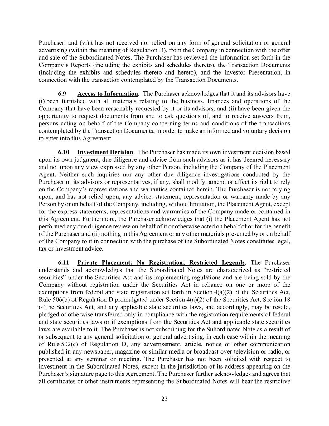 23 Purchaser; and (vi)it has not received nor relied on any form of general solicitation or general advertising (within the meaning of Regulation D), from the Company in connection with the offer and sale of the Subordinated Notes. The Purchaser has reviewed the information set forth in the Company’s Reports (including the exhibits and schedules thereto), the Transaction Documents (including the exhibits and schedules thereto and hereto), and the Investor Presentation, in connection with the transaction contemplated by the Transaction Documents. 6.9 Access to Information. The Purchaser acknowledges that it and its advisors have (i) been furnished with all materials relating to the business, finances and operations of the Company that have been reasonably requested by it or its advisors, and (ii) have been given the opportunity to request documents from and to ask questions of, and to receive answers from, persons acting on behalf of the Company concerning terms and conditions of the transactions contemplated by the Transaction Documents, in order to make an informed and voluntary decision to enter into this Agreement. 6.10 Investment Decision. The Purchaser has made its own investment decision based upon its own judgment, due diligence and advice from such advisors as it has deemed necessary and not upon any view expressed by any other Person, including the Company of the Placement Agent. Neither such inquiries nor any other due diligence investigations conducted by the Purchaser or its advisors or representatives, if any, shall modify, amend or affect its right to rely on the Company’s representations and warranties contained herein. The Purchaser is not relying upon, and has not relied upon, any advice, statement, representation or warranty made by any Person by or on behalf of the Company, including, without limitation, the Placement Agent, except for the express statements, representations and warranties of the Company made or contained in this Agreement. Furthermore, the Purchaser acknowledges that (i) the Placement Agent has not performed any due diligence review on behalf of it or otherwise acted on behalf of or for the benefit of the Purchaser and (ii) nothing in this Agreement or any other materials presented by or on behalf of the Company to it in connection with the purchase of the Subordinated Notes constitutes legal, tax or investment advice. 6.11 Private Placement; No Registration; Restricted Legends. The Purchaser understands and acknowledges that the Subordinated Notes are characterized as “restricted securities” under the Securities Act and its implementing regulations and are being sold by the Company without registration under the Securities Act in reliance on one or more of the exemptions from federal and state registration set forth in Section 4(a)(2) of the Securities Act, Rule 506(b) of Regulation D promulgated under Section 4(a)(2) of the Securities Act, Section 18 of the Securities Act, and any applicable state securities laws, and accordingly, may be resold, pledged or otherwise transferred only in compliance with the registration requirements of federal and state securities laws or if exemptions from the Securities Act and applicable state securities laws are available to it. The Purchaser is not subscribing for the Subordinated Note as a result of or subsequent to any general solicitation or general advertising, in each case within the meaning of Rule 502(c) of Regulation D, any advertisement, article, notice or other communication published in any newspaper, magazine or similar media or broadcast over television or radio, or presented at any seminar or meeting. The Purchaser has not been solicited with respect to investment in the Subordinated Notes, except in the jurisdiction of its address appearing on the Purchaser’s signature page to this Agreement. The Purchaser further acknowledges and agrees that all certificates or other instruments representing the Subordinated Notes will bear the restrictive