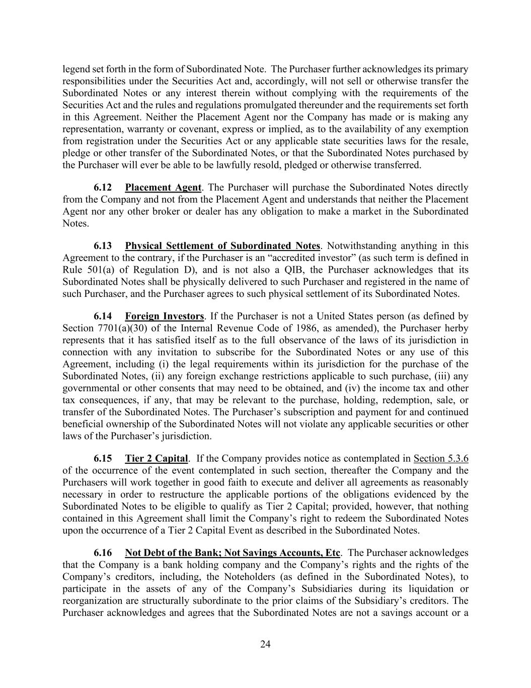 24 legend set forth in the form of Subordinated Note. The Purchaser further acknowledges its primary responsibilities under the Securities Act and, accordingly, will not sell or otherwise transfer the Subordinated Notes or any interest therein without complying with the requirements of the Securities Act and the rules and regulations promulgated thereunder and the requirements set forth in this Agreement. Neither the Placement Agent nor the Company has made or is making any representation, warranty or covenant, express or implied, as to the availability of any exemption from registration under the Securities Act or any applicable state securities laws for the resale, pledge or other transfer of the Subordinated Notes, or that the Subordinated Notes purchased by the Purchaser will ever be able to be lawfully resold, pledged or otherwise transferred. 6.12 Placement Agent. The Purchaser will purchase the Subordinated Notes directly from the Company and not from the Placement Agent and understands that neither the Placement Agent nor any other broker or dealer has any obligation to make a market in the Subordinated Notes. 6.13 Physical Settlement of Subordinated Notes. Notwithstanding anything in this Agreement to the contrary, if the Purchaser is an “accredited investor” (as such term is defined in Rule 501(a) of Regulation D), and is not also a QIB, the Purchaser acknowledges that its Subordinated Notes shall be physically delivered to such Purchaser and registered in the name of such Purchaser, and the Purchaser agrees to such physical settlement of its Subordinated Notes. 6.14 Foreign Investors. If the Purchaser is not a United States person (as defined by Section 7701(a)(30) of the Internal Revenue Code of 1986, as amended), the Purchaser herby represents that it has satisfied itself as to the full observance of the laws of its jurisdiction in connection with any invitation to subscribe for the Subordinated Notes or any use of this Agreement, including (i) the legal requirements within its jurisdiction for the purchase of the Subordinated Notes, (ii) any foreign exchange restrictions applicable to such purchase, (iii) any governmental or other consents that may need to be obtained, and (iv) the income tax and other tax consequences, if any, that may be relevant to the purchase, holding, redemption, sale, or transfer of the Subordinated Notes. The Purchaser’s subscription and payment for and continued beneficial ownership of the Subordinated Notes will not violate any applicable securities or other laws of the Purchaser’s jurisdiction. 6.15 Tier 2 Capital. If the Company provides notice as contemplated in Section 5.3.6 of the occurrence of the event contemplated in such section, thereafter the Company and the Purchasers will work together in good faith to execute and deliver all agreements as reasonably necessary in order to restructure the applicable portions of the obligations evidenced by the Subordinated Notes to be eligible to qualify as Tier 2 Capital; provided, however, that nothing contained in this Agreement shall limit the Company’s right to redeem the Subordinated Notes upon the occurrence of a Tier 2 Capital Event as described in the Subordinated Notes. 6.16 Not Debt of the Bank; Not Savings Accounts, Etc. The Purchaser acknowledges that the Company is a bank holding company and the Company’s rights and the rights of the Company’s creditors, including, the Noteholders (as defined in the Subordinated Notes), to participate in the assets of any of the Company’s Subsidiaries during its liquidation or reorganization are structurally subordinate to the prior claims of the Subsidiary’s creditors. The Purchaser acknowledges and agrees that the Subordinated Notes are not a savings account or a
