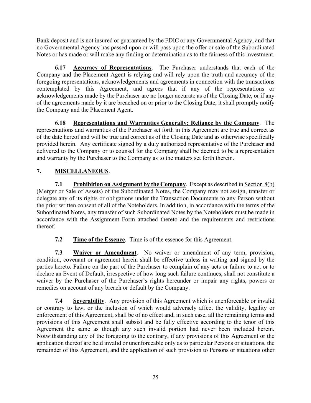 25 Bank deposit and is not insured or guaranteed by the FDIC or any Governmental Agency, and that no Governmental Agency has passed upon or will pass upon the offer or sale of the Subordinated Notes or has made or will make any finding or determination as to the fairness of this investment. 6.17 Accuracy of Representations. The Purchaser understands that each of the Company and the Placement Agent is relying and will rely upon the truth and accuracy of the foregoing representations, acknowledgements and agreements in connection with the transactions contemplated by this Agreement, and agrees that if any of the representations or acknowledgements made by the Purchaser are no longer accurate as of the Closing Date, or if any of the agreements made by it are breached on or prior to the Closing Date, it shall promptly notify the Company and the Placement Agent. 6.18 Representations and Warranties Generally; Reliance by the Company. The representations and warranties of the Purchaser set forth in this Agreement are true and correct as of the date hereof and will be true and correct as of the Closing Date and as otherwise specifically provided herein. Any certificate signed by a duly authorized representative of the Purchaser and delivered to the Company or to counsel for the Company shall be deemed to be a representation and warranty by the Purchaser to the Company as to the matters set forth therein. 7. MISCELLANEOUS. 7.1 Prohibition on Assignment by the Company. Except as described in Section 8(b) (Merger or Sale of Assets) of the Subordinated Notes, the Company may not assign, transfer or delegate any of its rights or obligations under the Transaction Documents to any Person without the prior written consent of all of the Noteholders. In addition, in accordance with the terms of the Subordinated Notes, any transfer of such Subordinated Notes by the Noteholders must be made in accordance with the Assignment Form attached thereto and the requirements and restrictions thereof. 7.2 Time of the Essence. Time is of the essence for this Agreement. 7.3 Waiver or Amendment. No waiver or amendment of any term, provision, condition, covenant or agreement herein shall be effective unless in writing and signed by the parties hereto. Failure on the part of the Purchaser to complain of any acts or failure to act or to declare an Event of Default, irrespective of how long such failure continues, shall not constitute a waiver by the Purchaser of the Purchaser’s rights hereunder or impair any rights, powers or remedies on account of any breach or default by the Company. 7.4 Severability. Any provision of this Agreement which is unenforceable or invalid or contrary to law, or the inclusion of which would adversely affect the validity, legality or enforcement of this Agreement, shall be of no effect and, in such case, all the remaining terms and provisions of this Agreement shall subsist and be fully effective according to the tenor of this Agreement the same as though any such invalid portion had never been included herein. Notwithstanding any of the foregoing to the contrary, if any provisions of this Agreement or the application thereof are held invalid or unenforceable only as to particular Persons or situations, the remainder of this Agreement, and the application of such provision to Persons or situations other