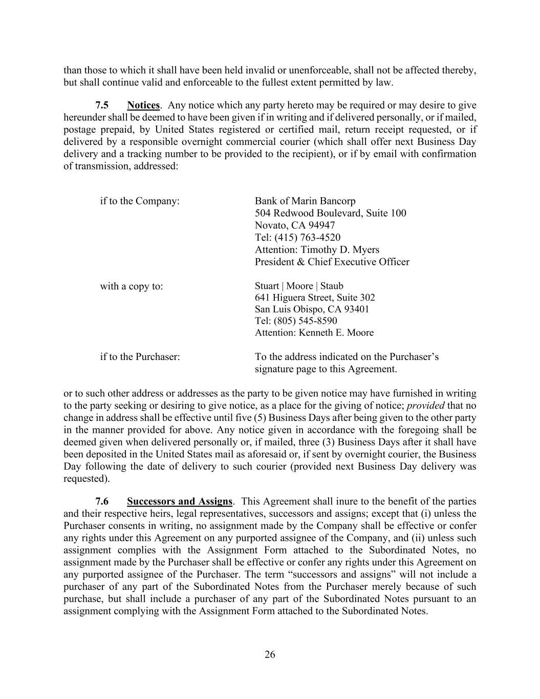 26 than those to which it shall have been held invalid or unenforceable, shall not be affected thereby, but shall continue valid and enforceable to the fullest extent permitted by law. 7.5 Notices. Any notice which any party hereto may be required or may desire to give hereunder shall be deemed to have been given if in writing and if delivered personally, or if mailed, postage prepaid, by United States registered or certified mail, return receipt requested, or if delivered by a responsible overnight commercial courier (which shall offer next Business Day delivery and a tracking number to be provided to the recipient), or if by email with confirmation of transmission, addressed: if to the Company: Bank of Marin Bancorp 504 Redwood Boulevard, Suite 100 Novato, CA 94947 Tel: (415) 763-4520 Attention: Timothy D. Myers President & Chief Executive Officer with a copy to: Stuart | Moore | Staub 641 Higuera Street, Suite 302 San Luis Obispo, CA 93401 Tel: (805) 545-8590 Attention: Kenneth E. Moore if to the Purchaser: To the address indicated on the Purchaser’s signature page to this Agreement. or to such other address or addresses as the party to be given notice may have furnished in writing to the party seeking or desiring to give notice, as a place for the giving of notice; provided that no change in address shall be effective until five (5) Business Days after being given to the other party in the manner provided for above. Any notice given in accordance with the foregoing shall be deemed given when delivered personally or, if mailed, three (3) Business Days after it shall have been deposited in the United States mail as aforesaid or, if sent by overnight courier, the Business Day following the date of delivery to such courier (provided next Business Day delivery was requested). 7.6 Successors and Assigns. This Agreement shall inure to the benefit of the parties and their respective heirs, legal representatives, successors and assigns; except that (i) unless the Purchaser consents in writing, no assignment made by the Company shall be effective or confer any rights under this Agreement on any purported assignee of the Company, and (ii) unless such assignment complies with the Assignment Form attached to the Subordinated Notes, no assignment made by the Purchaser shall be effective or confer any rights under this Agreement on any purported assignee of the Purchaser. The term “successors and assigns” will not include a purchaser of any part of the Subordinated Notes from the Purchaser merely because of such purchase, but shall include a purchaser of any part of the Subordinated Notes pursuant to an assignment complying with the Assignment Form attached to the Subordinated Notes.