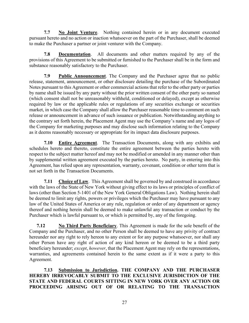 27 7.7 No Joint Venture. Nothing contained herein or in any document executed pursuant hereto and no action or inaction whatsoever on the part of the Purchaser, shall be deemed to make the Purchaser a partner or joint venturer with the Company. 7.8 Documentation. All documents and other matters required by any of the provisions of this Agreement to be submitted or furnished to the Purchaser shall be in the form and substance reasonably satisfactory to the Purchaser. 7.9 Public Announcement. The Company and the Purchaser agree that no public release, statement, announcement, or other disclosure detailing the purchase of the Subordinated Notes pursuant to this Agreement or other commercial actions that refer to the other party or parties by name shall be issued by any party without the prior written consent of the other party so named (which consent shall not be unreasonably withheld, conditioned or delayed), except as otherwise required by law or the applicable rules or regulations of any securities exchange or securities market, in which case the Company shall allow the Purchaser reasonable time to comment on such release or announcement in advance of such issuance or publication. Notwithstanding anything to the contrary set forth herein, the Placement Agent may use the Company’s name and any logos of the Company for marketing purposes and may disclose such information relating to the Company as it deems reasonably necessary or appropriate for its impact data disclosure purposes. 7.10 Entire Agreement. The Transaction Documents, along with any exhibits and schedules hereto and thereto, constitute the entire agreement between the parties hereto with respect to the subject matter hereof and may not be modified or amended in any manner other than by supplemental written agreement executed by the parties hereto. No party, in entering into this Agreement, has relied upon any representation, warranty, covenant, condition or other term that is not set forth in the Transaction Documents. 7.11 Choice of Law. This Agreement shall be governed by and construed in accordance with the laws of the State of New York without giving effect to its laws or principles of conflict of laws (other than Section 5-1401 of the New York General Obligations Law). Nothing herein shall be deemed to limit any rights, powers or privileges which the Purchaser may have pursuant to any law of the United States of America or any rule, regulation or order of any department or agency thereof and nothing herein shall be deemed to make unlawful any transaction or conduct by the Purchaser which is lawful pursuant to, or which is permitted by, any of the foregoing. 7.12 No Third Party Beneficiary. This Agreement is made for the sole benefit of the Company and the Purchaser, and no other Person shall be deemed to have any privity of contract hereunder nor any right to rely hereon to any extent or for any purpose whatsoever, nor shall any other Person have any right of action of any kind hereon or be deemed to be a third party beneficiary hereunder; except, however, that the Placement Agent may rely on the representations, warranties, and agreements contained herein to the same extent as if it were a party to this Agreement. 7.13 Submission to Jurisdiction. THE COMPANY AND THE PURCHASER HEREBY IRREVOCABLY SUBMIT TO THE EXCLUSIVE JURISDICTION OF THE STATE AND FEDERAL COURTS SITTING IN NEW YORK OVER ANY ACTION OR PROCEEDING ARISING OUT OF OR RELATING TO THE TRANSACTION