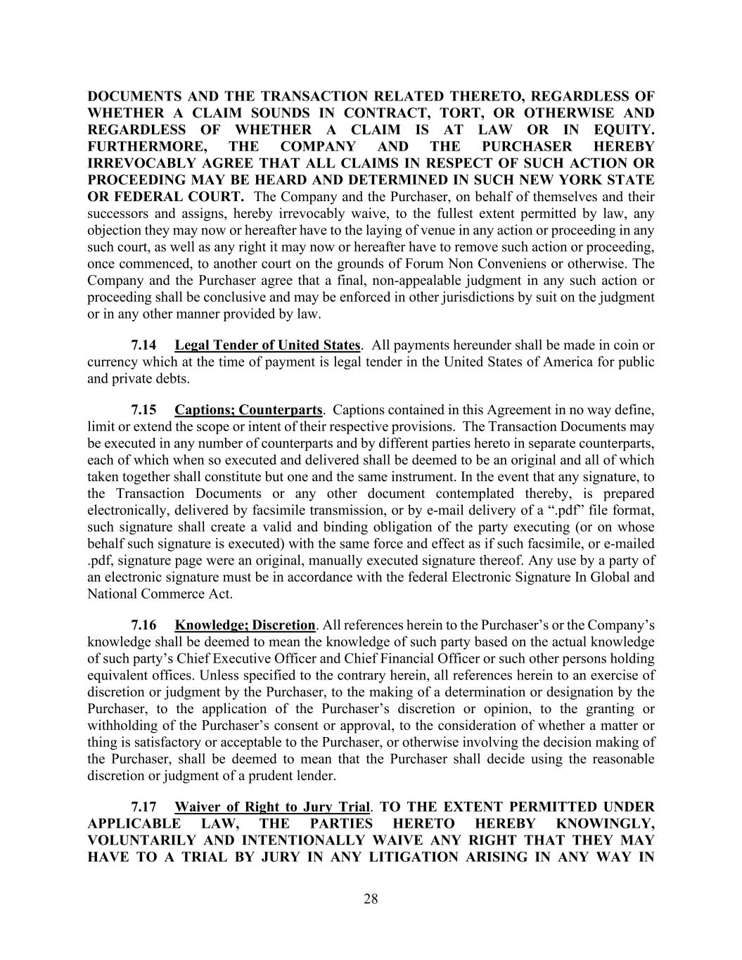 28 DOCUMENTS AND THE TRANSACTION RELATED THERETO, REGARDLESS OF WHETHER A CLAIM SOUNDS IN CONTRACT, TORT, OR OTHERWISE AND REGARDLESS OF WHETHER A CLAIM IS AT LAW OR IN EQUITY. FURTHERMORE, THE COMPANY AND THE PURCHASER HEREBY IRREVOCABLY AGREE THAT ALL CLAIMS IN RESPECT OF SUCH ACTION OR PROCEEDING MAY BE HEARD AND DETERMINED IN SUCH NEW YORK STATE OR FEDERAL COURT. The Company and the Purchaser, on behalf of themselves and their successors and assigns, hereby irrevocably waive, to the fullest extent permitted by law, any objection they may now or hereafter have to the laying of venue in any action or proceeding in any such court, as well as any right it may now or hereafter have to remove such action or proceeding, once commenced, to another court on the grounds of Forum Non Conveniens or otherwise. The Company and the Purchaser agree that a final, non-appealable judgment in any such action or proceeding shall be conclusive and may be enforced in other jurisdictions by suit on the judgment or in any other manner provided by law. 7.14 Legal Tender of United States. All payments hereunder shall be made in coin or currency which at the time of payment is legal tender in the United States of America for public and private debts. 7.15 Captions; Counterparts. Captions contained in this Agreement in no way define, limit or extend the scope or intent of their respective provisions. The Transaction Documents may be executed in any number of counterparts and by different parties hereto in separate counterparts, each of which when so executed and delivered shall be deemed to be an original and all of which taken together shall constitute but one and the same instrument. In the event that any signature, to the Transaction Documents or any other document contemplated thereby, is prepared electronically, delivered by facsimile transmission, or by e-mail delivery of a “.pdf” file format, such signature shall create a valid and binding obligation of the party executing (or on whose behalf such signature is executed) with the same force and effect as if such facsimile, or e-mailed .pdf, signature page were an original, manually executed signature thereof. Any use by a party of an electronic signature must be in accordance with the federal Electronic Signature In Global and National Commerce Act. 7.16 Knowledge; Discretion. All references herein to the Purchaser’s or the Company’s knowledge shall be deemed to mean the knowledge of such party based on the actual knowledge of such party’s Chief Executive Officer and Chief Financial Officer or such other persons holding equivalent offices. Unless specified to the contrary herein, all references herein to an exercise of discretion or judgment by the Purchaser, to the making of a determination or designation by the Purchaser, to the application of the Purchaser’s discretion or opinion, to the granting or withholding of the Purchaser’s consent or approval, to the consideration of whether a matter or thing is satisfactory or acceptable to the Purchaser, or otherwise involving the decision making of the Purchaser, shall be deemed to mean that the Purchaser shall decide using the reasonable discretion or judgment of a prudent lender. 7.17 Waiver of Right to Jury Trial. TO THE EXTENT PERMITTED UNDER APPLICABLE LAW, THE PARTIES HERETO HEREBY KNOWINGLY, VOLUNTARILY AND INTENTIONALLY WAIVE ANY RIGHT THAT THEY MAY HAVE TO A TRIAL BY JURY IN ANY LITIGATION ARISING IN ANY WAY IN