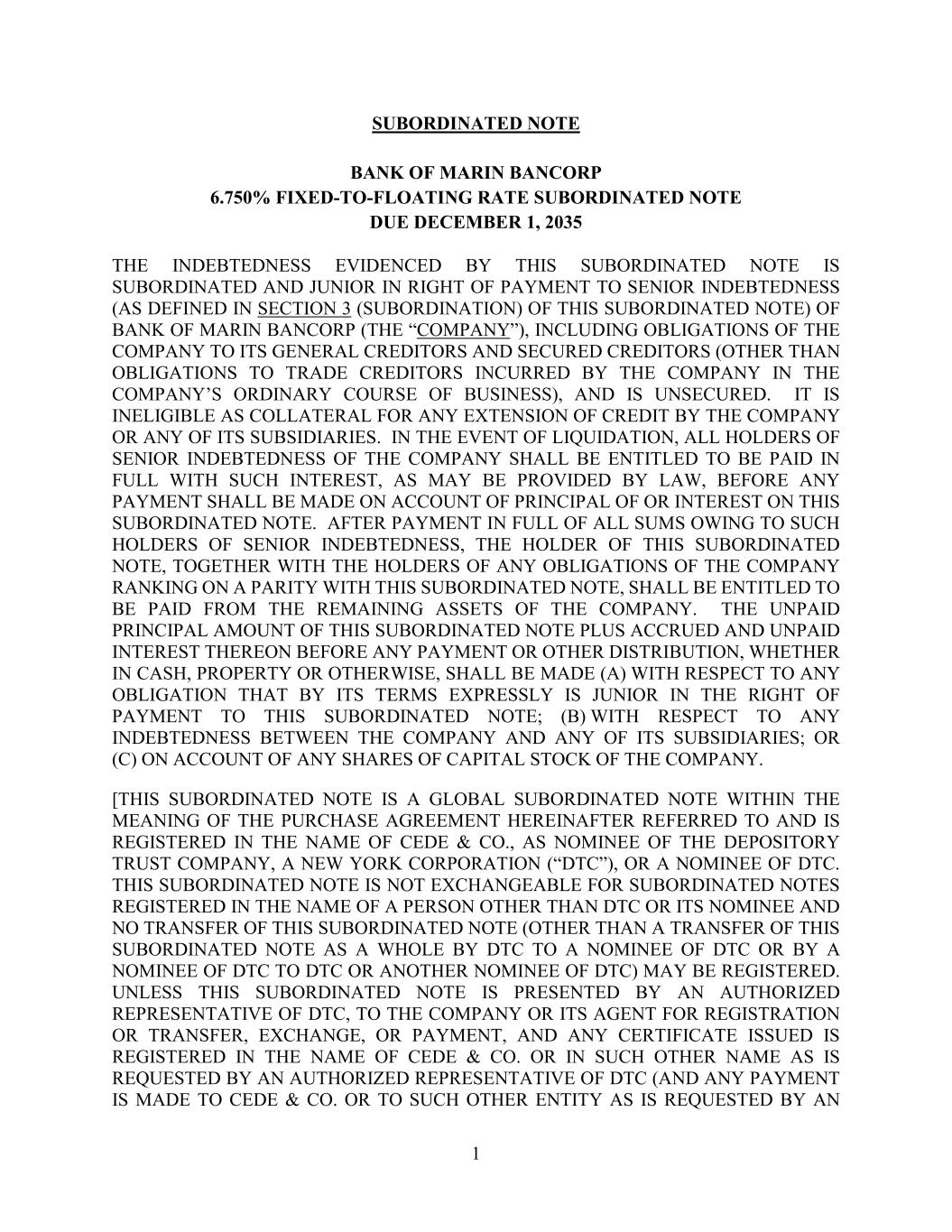 1 SUBORDINATED NOTE BANK OF MARIN BANCORP 6.750% FIXED-TO-FLOATING RATE SUBORDINATED NOTE DUE DECEMBER 1, 2035 THE INDEBTEDNESS EVIDENCED BY THIS SUBORDINATED NOTE IS SUBORDINATED AND JUNIOR IN RIGHT OF PAYMENT TO SENIOR INDEBTEDNESS (AS DEFINED IN SECTION 3 (SUBORDINATION) OF THIS SUBORDINATED NOTE) OF BANK OF MARIN BANCORP (THE “COMPANY”), INCLUDING OBLIGATIONS OF THE COMPANY TO ITS GENERAL CREDITORS AND SECURED CREDITORS (OTHER THAN OBLIGATIONS TO TRADE CREDITORS INCURRED BY THE COMPANY IN THE COMPANY’S ORDINARY COURSE OF BUSINESS), AND IS UNSECURED. IT IS INELIGIBLE AS COLLATERAL FOR ANY EXTENSION OF CREDIT BY THE COMPANY OR ANY OF ITS SUBSIDIARIES. IN THE EVENT OF LIQUIDATION, ALL HOLDERS OF SENIOR INDEBTEDNESS OF THE COMPANY SHALL BE ENTITLED TO BE PAID IN FULL WITH SUCH INTEREST, AS MAY BE PROVIDED BY LAW, BEFORE ANY PAYMENT SHALL BE MADE ON ACCOUNT OF PRINCIPAL OF OR INTEREST ON THIS SUBORDINATED NOTE. AFTER PAYMENT IN FULL OF ALL SUMS OWING TO SUCH HOLDERS OF SENIOR INDEBTEDNESS, THE HOLDER OF THIS SUBORDINATED NOTE, TOGETHER WITH THE HOLDERS OF ANY OBLIGATIONS OF THE COMPANY RANKING ON A PARITY WITH THIS SUBORDINATED NOTE, SHALL BE ENTITLED TO BE PAID FROM THE REMAINING ASSETS OF THE COMPANY. THE UNPAID PRINCIPAL AMOUNT OF THIS SUBORDINATED NOTE PLUS ACCRUED AND UNPAID INTEREST THEREON BEFORE ANY PAYMENT OR OTHER DISTRIBUTION, WHETHER IN CASH, PROPERTY OR OTHERWISE, SHALL BE MADE (A) WITH RESPECT TO ANY OBLIGATION THAT BY ITS TERMS EXPRESSLY IS JUNIOR IN THE RIGHT OF PAYMENT TO THIS SUBORDINATED NOTE; (B) WITH RESPECT TO ANY INDEBTEDNESS BETWEEN THE COMPANY AND ANY OF ITS SUBSIDIARIES; OR (C) ON ACCOUNT OF ANY SHARES OF CAPITAL STOCK OF THE COMPANY. [THIS SUBORDINATED NOTE IS A GLOBAL SUBORDINATED NOTE WITHIN THE MEANING OF THE PURCHASE AGREEMENT HEREINAFTER REFERRED TO AND IS REGISTERED IN THE NAME OF CEDE & CO., AS NOMINEE OF THE DEPOSITORY TRUST COMPANY, A NEW YORK CORPORATION (“DTC”), OR A NOMINEE OF DTC. THIS SUBORDINATED NOTE IS NOT EXCHANGEABLE FOR SUBORDINATED NOTES REGISTERED IN THE NAME OF A PERSON OTHER THAN DTC OR ITS NOMINEE AND NO TRANSFER OF THIS SUBORDINATED NOTE (OTHER THAN A TRANSFER OF THIS SUBORDINATED NOTE AS A WHOLE BY DTC TO A NOMINEE OF DTC OR BY A NOMINEE OF DTC TO DTC OR ANOTHER NOMINEE OF DTC) MAY BE REGISTERED. UNLESS THIS SUBORDINATED NOTE IS PRESENTED BY AN AUTHORIZED REPRESENTATIVE OF DTC, TO THE COMPANY OR ITS AGENT FOR REGISTRATION OR TRANSFER, EXCHANGE, OR PAYMENT, AND ANY CERTIFICATE ISSUED IS REGISTERED IN THE NAME OF CEDE & CO. OR IN SUCH OTHER NAME AS IS REQUESTED BY AN AUTHORIZED REPRESENTATIVE OF DTC (AND ANY PAYMENT IS MADE TO CEDE & CO. OR TO SUCH OTHER ENTITY AS IS REQUESTED BY AN