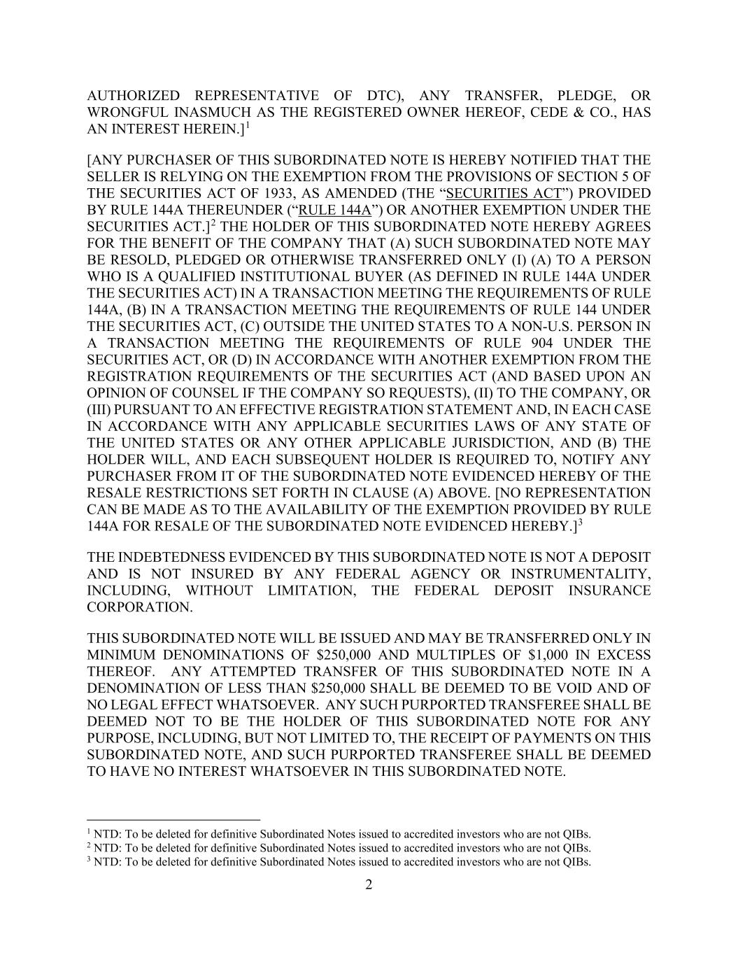 2 AUTHORIZED REPRESENTATIVE OF DTC), ANY TRANSFER, PLEDGE, OR WRONGFUL INASMUCH AS THE REGISTERED OWNER HEREOF, CEDE & CO., HAS AN INTEREST HEREIN.]1 [ANY PURCHASER OF THIS SUBORDINATED NOTE IS HEREBY NOTIFIED THAT THE SELLER IS RELYING ON THE EXEMPTION FROM THE PROVISIONS OF SECTION 5 OF THE SECURITIES ACT OF 1933, AS AMENDED (THE “SECURITIES ACT”) PROVIDED BY RULE 144A THEREUNDER (“RULE 144A”) OR ANOTHER EXEMPTION UNDER THE SECURITIES ACT.]2 THE HOLDER OF THIS SUBORDINATED NOTE HEREBY AGREES FOR THE BENEFIT OF THE COMPANY THAT (A) SUCH SUBORDINATED NOTE MAY BE RESOLD, PLEDGED OR OTHERWISE TRANSFERRED ONLY (I) (A) TO A PERSON WHO IS A QUALIFIED INSTITUTIONAL BUYER (AS DEFINED IN RULE 144A UNDER THE SECURITIES ACT) IN A TRANSACTION MEETING THE REQUIREMENTS OF RULE 144A, (B) IN A TRANSACTION MEETING THE REQUIREMENTS OF RULE 144 UNDER THE SECURITIES ACT, (C) OUTSIDE THE UNITED STATES TO A NON-U.S. PERSON IN A TRANSACTION MEETING THE REQUIREMENTS OF RULE 904 UNDER THE SECURITIES ACT, OR (D) IN ACCORDANCE WITH ANOTHER EXEMPTION FROM THE REGISTRATION REQUIREMENTS OF THE SECURITIES ACT (AND BASED UPON AN OPINION OF COUNSEL IF THE COMPANY SO REQUESTS), (II) TO THE COMPANY, OR (III) PURSUANT TO AN EFFECTIVE REGISTRATION STATEMENT AND, IN EACH CASE IN ACCORDANCE WITH ANY APPLICABLE SECURITIES LAWS OF ANY STATE OF THE UNITED STATES OR ANY OTHER APPLICABLE JURISDICTION, AND (B) THE HOLDER WILL, AND EACH SUBSEQUENT HOLDER IS REQUIRED TO, NOTIFY ANY PURCHASER FROM IT OF THE SUBORDINATED NOTE EVIDENCED HEREBY OF THE RESALE RESTRICTIONS SET FORTH IN CLAUSE (A) ABOVE. [NO REPRESENTATION CAN BE MADE AS TO THE AVAILABILITY OF THE EXEMPTION PROVIDED BY RULE 144A FOR RESALE OF THE SUBORDINATED NOTE EVIDENCED HEREBY.]3 THE INDEBTEDNESS EVIDENCED BY THIS SUBORDINATED NOTE IS NOT A DEPOSIT AND IS NOT INSURED BY ANY FEDERAL AGENCY OR INSTRUMENTALITY, INCLUDING, WITHOUT LIMITATION, THE FEDERAL DEPOSIT INSURANCE CORPORATION. THIS SUBORDINATED NOTE WILL BE ISSUED AND MAY BE TRANSFERRED ONLY IN MINIMUM DENOMINATIONS OF $250,000 AND MULTIPLES OF $1,000 IN EXCESS THEREOF. ANY ATTEMPTED TRANSFER OF THIS SUBORDINATED NOTE IN A DENOMINATION OF LESS THAN $250,000 SHALL BE DEEMED TO BE VOID AND OF NO LEGAL EFFECT WHATSOEVER. ANY SUCH PURPORTED TRANSFEREE SHALL BE DEEMED NOT TO BE THE HOLDER OF THIS SUBORDINATED NOTE FOR ANY PURPOSE, INCLUDING, BUT NOT LIMITED TO, THE RECEIPT OF PAYMENTS ON THIS SUBORDINATED NOTE, AND SUCH PURPORTED TRANSFEREE SHALL BE DEEMED TO HAVE NO INTEREST WHATSOEVER IN THIS SUBORDINATED NOTE. 1 NTD: To be deleted for definitive Subordinated Notes issued to accredited investors who are not QIBs. 2 NTD: To be deleted for definitive Subordinated Notes issued to accredited investors who are not QIBs. 3 NTD: To be deleted for definitive Subordinated Notes issued to accredited investors who are not QIBs.