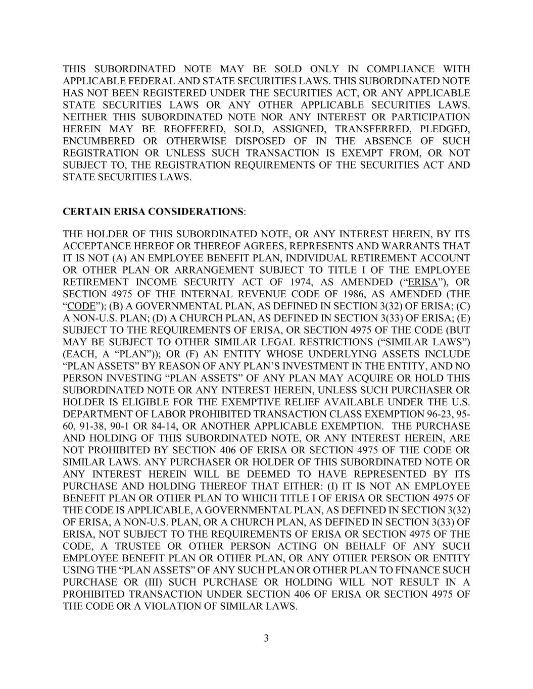 3 THIS SUBORDINATED NOTE MAY BE SOLD ONLY IN COMPLIANCE WITH APPLICABLE FEDERAL AND STATE SECURITIES LAWS. THIS SUBORDINATED NOTE HAS NOT BEEN REGISTERED UNDER THE SECURITIES ACT, OR ANY APPLICABLE STATE SECURITIES LAWS OR ANY OTHER APPLICABLE SECURITIES LAWS. NEITHER THIS SUBORDINATED NOTE NOR ANY INTEREST OR PARTICIPATION HEREIN MAY BE REOFFERED, SOLD, ASSIGNED, TRANSFERRED, PLEDGED, ENCUMBERED OR OTHERWISE DISPOSED OF IN THE ABSENCE OF SUCH REGISTRATION OR UNLESS SUCH TRANSACTION IS EXEMPT FROM, OR NOT SUBJECT TO, THE REGISTRATION REQUIREMENTS OF THE SECURITIES ACT AND STATE SECURITIES LAWS. CERTAIN ERISA CONSIDERATIONS: THE HOLDER OF THIS SUBORDINATED NOTE, OR ANY INTEREST HEREIN, BY ITS ACCEPTANCE HEREOF OR THEREOF AGREES, REPRESENTS AND WARRANTS THAT IT IS NOT (A) AN EMPLOYEE BENEFIT PLAN, INDIVIDUAL RETIREMENT ACCOUNT OR OTHER PLAN OR ARRANGEMENT SUBJECT TO TITLE I OF THE EMPLOYEE RETIREMENT INCOME SECURITY ACT OF 1974, AS AMENDED (“ERISA”), OR SECTION 4975 OF THE INTERNAL REVENUE CODE OF 1986, AS AMENDED (THE “CODE”); (B) A GOVERNMENTAL PLAN, AS DEFINED IN SECTION 3(32) OF ERISA; (C) A NON-U.S. PLAN; (D) A CHURCH PLAN, AS DEFINED IN SECTION 3(33) OF ERISA; (E) SUBJECT TO THE REQUIREMENTS OF ERISA, OR SECTION 4975 OF THE CODE (BUT MAY BE SUBJECT TO OTHER SIMILAR LEGAL RESTRICTIONS (“SIMILAR LAWS”) (EACH, A “PLAN”)); OR (F) AN ENTITY WHOSE UNDERLYING ASSETS INCLUDE “PLAN ASSETS” BY REASON OF ANY PLAN’S INVESTMENT IN THE ENTITY, AND NO PERSON INVESTING “PLAN ASSETS” OF ANY PLAN MAY ACQUIRE OR HOLD THIS SUBORDINATED NOTE OR ANY INTEREST HEREIN, UNLESS SUCH PURCHASER OR HOLDER IS ELIGIBLE FOR THE EXEMPTIVE RELIEF AVAILABLE UNDER THE U.S. DEPARTMENT OF LABOR PROHIBITED TRANSACTION CLASS EXEMPTION 96-23, 95- 60, 91-38, 90-1 OR 84-14, OR ANOTHER APPLICABLE EXEMPTION. THE PURCHASE AND HOLDING OF THIS SUBORDINATED NOTE, OR ANY INTEREST HEREIN, ARE NOT PROHIBITED BY SECTION 406 OF ERISA OR SECTION 4975 OF THE CODE OR SIMILAR LAWS. ANY PURCHASER OR HOLDER OF THIS SUBORDINATED NOTE OR ANY INTEREST HEREIN WILL BE DEEMED TO HAVE REPRESENTED BY ITS PURCHASE AND HOLDING THEREOF THAT EITHER: (I) IT IS NOT AN EMPLOYEE BENEFIT PLAN OR OTHER PLAN TO WHICH TITLE I OF ERISA OR SECTION 4975 OF THE CODE IS APPLICABLE, A GOVERNMENTAL PLAN, AS DEFINED IN SECTION 3(32) OF ERISA, A NON-U.S. PLAN, OR A CHURCH PLAN, AS DEFINED IN SECTION 3(33) OF ERISA, NOT SUBJECT TO THE REQUIREMENTS OF ERISA OR SECTION 4975 OF THE CODE, A TRUSTEE OR OTHER PERSON ACTING ON BEHALF OF ANY SUCH EMPLOYEE BENEFIT PLAN OR OTHER PLAN, OR ANY OTHER PERSON OR ENTITY USING THE “PLAN ASSETS” OF ANY SUCH PLAN OR OTHER PLAN TO FINANCE SUCH PURCHASE OR (III) SUCH PURCHASE OR HOLDING WILL NOT RESULT IN A PROHIBITED TRANSACTION UNDER SECTION 406 OF ERISA OR SECTION 4975 OF THE CODE OR A VIOLATION OF SIMILAR LAWS.